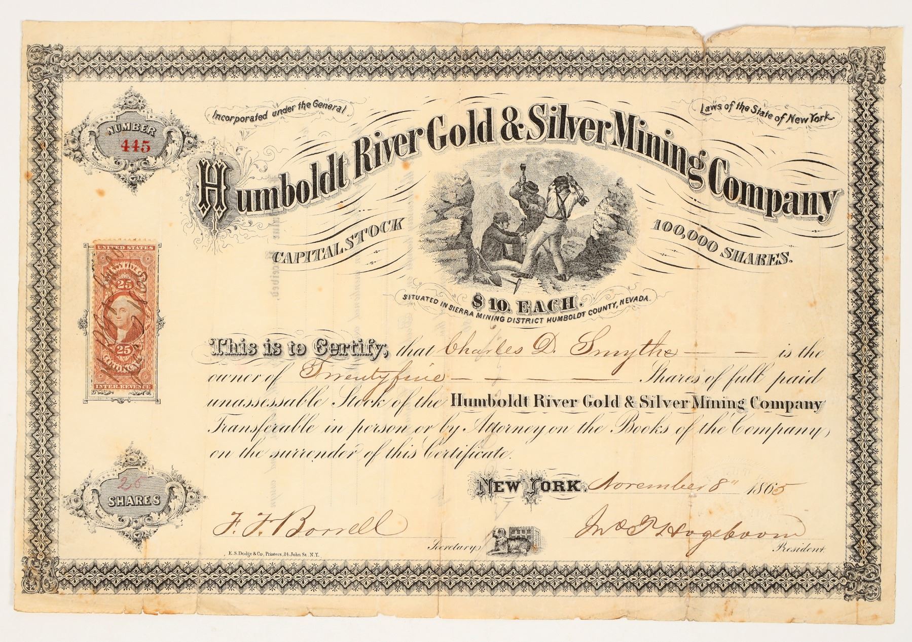 Rare. Situated in Sierra Mining District, Humboldt County, Nevada (printed under vignette). Inc. in New York. Inc. in New York. No. 445, issued for 25 shares in New York in 1865. Signed by president Hugoboom and secretary Borrell. Not cancelled. Two 25 cent revenue stamps. Mining vignette. Deep folds with discoloration, tears along edges. This company operated at Dun Glen, Humboldt County, Nevada.