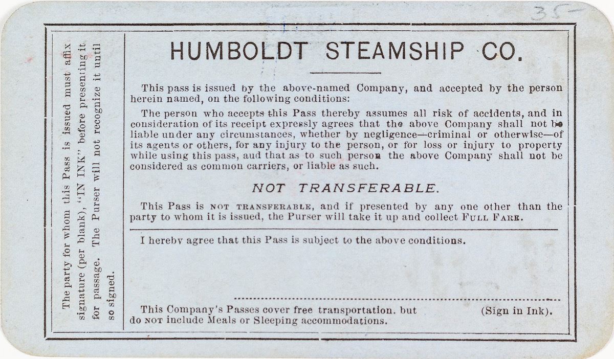 No. 37, issued to I.A. Nadeau, general agent for the Northern Pacific Railroad in Seattle for the year 1901. Signed by the general manager. Printed on blue cardstock. Some soiling. Originally built in 1896 in Eureka, California for logging purposes, the steamer Humboldt was converted to a passenger and freight ship for the Klondike Gold Rush. An iconic 1901 picture shows it loaded with hopeful passengers leaving Seattle for the chance at striking it rich in Nome. (Prag Collection) City: State: Washington Date: Inventory# 39164