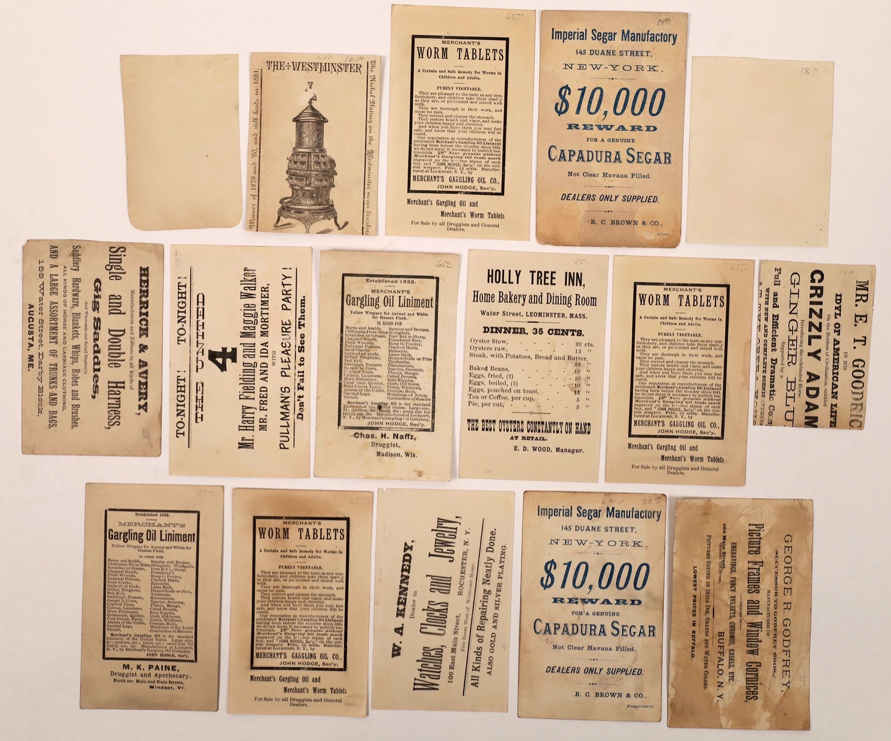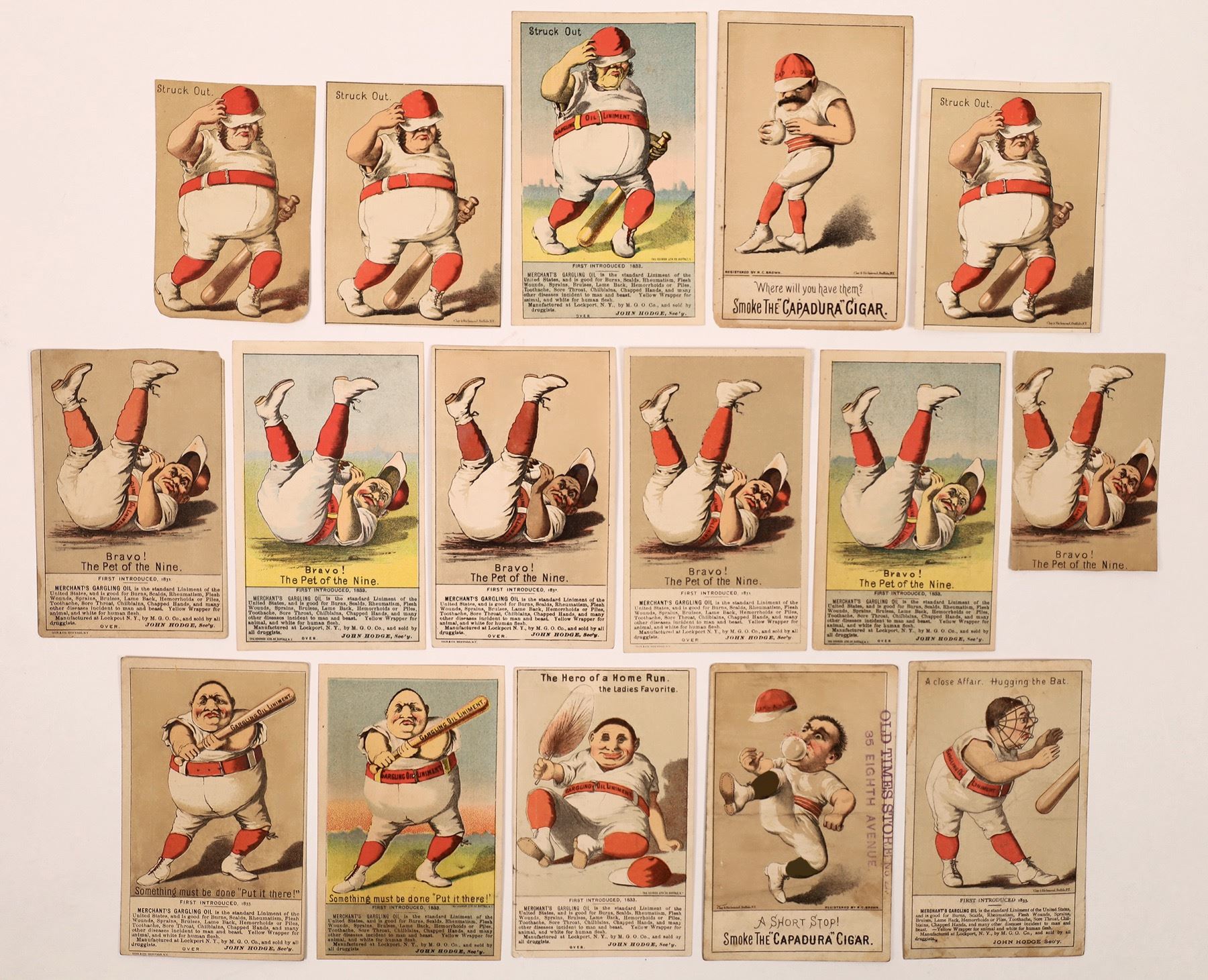Sixteen advertising trading cards from several different companies. Cards feature humorous baseball images with themes like "Struck Out," "Bravo," "A Close Affair, Hugging the Bat," and many more. Company ads on the reverse include Merchant's Worm Tablets, W.A. Kennedy Watches, Clocks and Jewelry, Herrick & Avery Single and Double Harness, Gig Saddles and many more. These are unique and a rarity. Please see photos for more detail and condition.