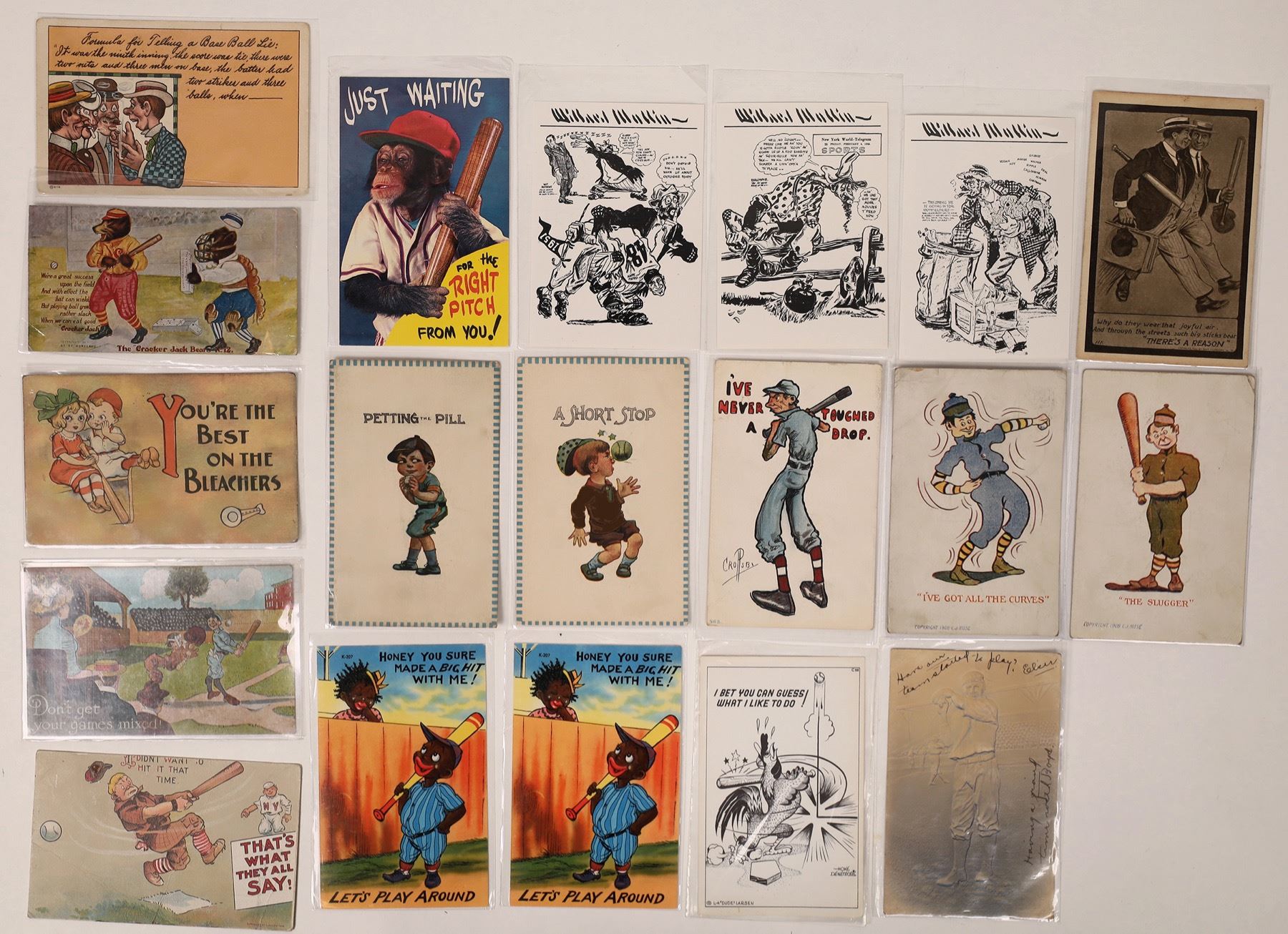 Collection of 18 humorous baseball postcards. Several brightly colored cartoon cards with funny sayings an one drawn by famous sports cartoonist Willard Mullin. All are in nice condition, some blank, some used. Please see photos for more detail and condition.