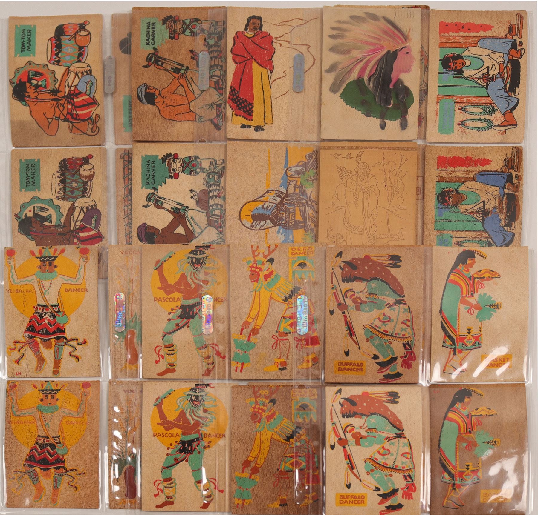 32 humorous Indian postcards printed on Yucca veneer. Postcards illustrate dances such as buffalo, basket, deer, corn, devil, Pascola and Yucca Kachina and occupations such as belt weaver, Kachina carver, tom-tom maker and basket maker.