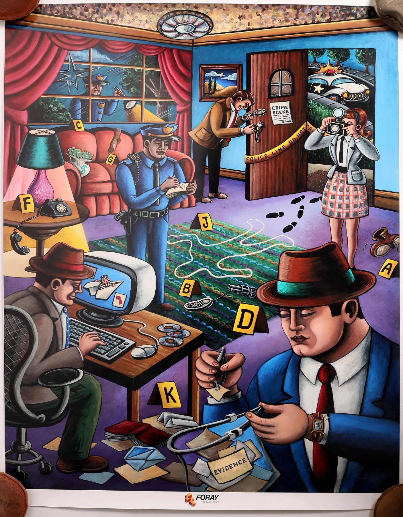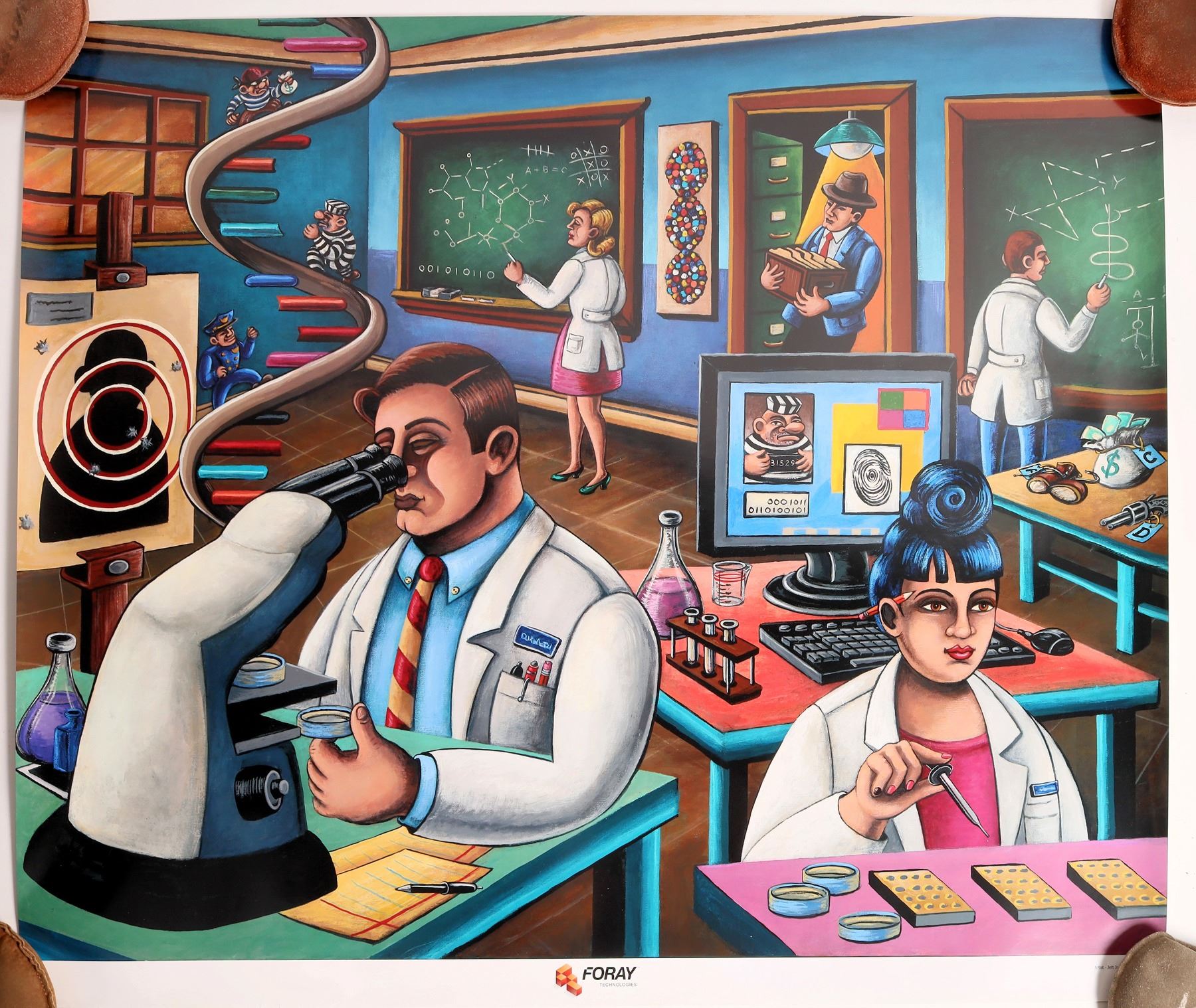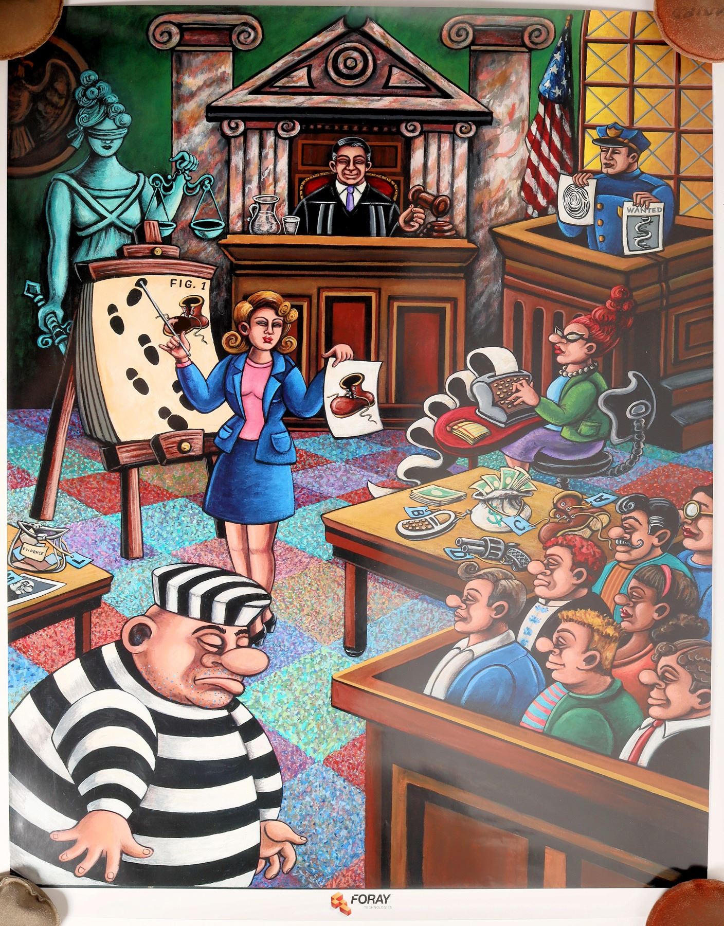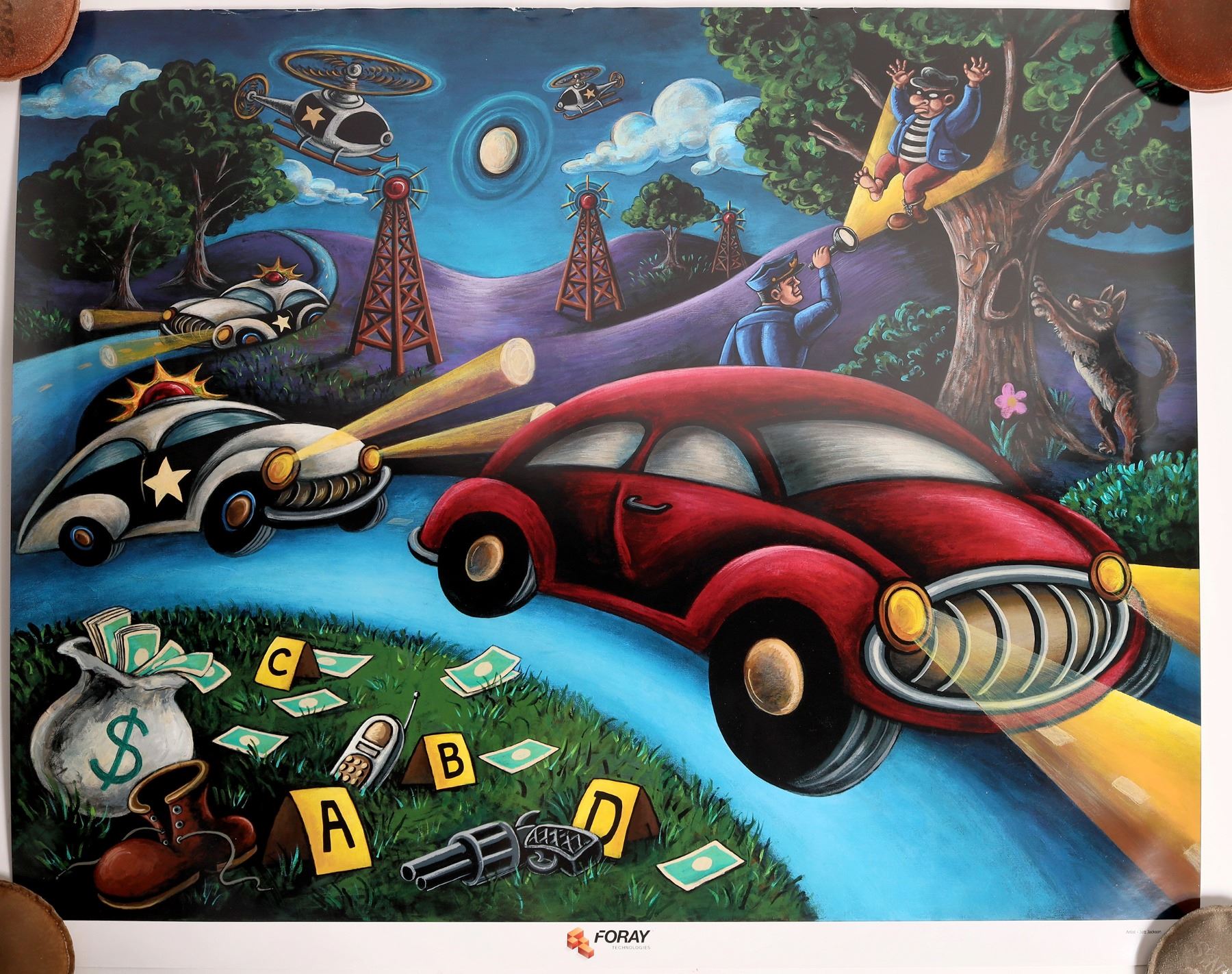 Lot of five different humorous law enforcement posters by the artist Jett Jackson. These posters depict law enforcement in various different scenarios including at a crime scene, arresting criminals, in the courtroom, etc. Very vibrant posters. Each is approx. 26 x 35 inches, good condition.