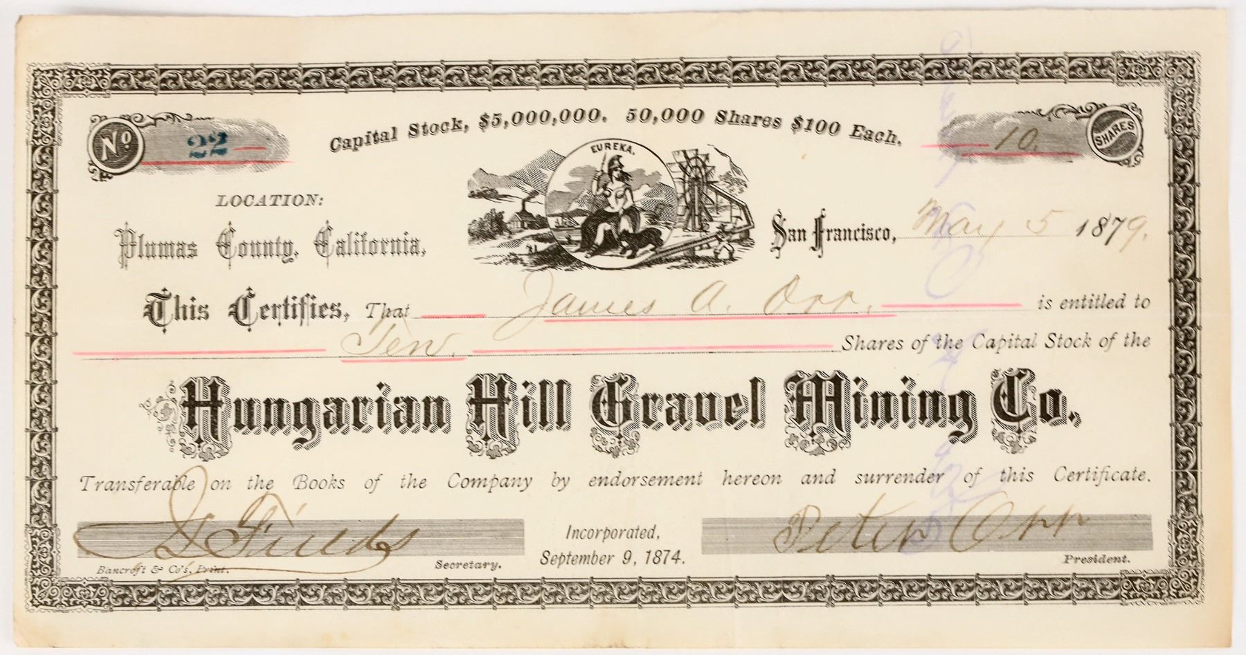 "Location: Plumas County, California." Inc. 1874. Very rare; we've only listed one from Prag before. No. 22, issued in 1879 in San Francisco to James A. Orr. Signed by president Peter Orr and secretary Fields. Not cancelled. This was a placer operation. Original directors were JD Goodwin, LF Cate, Fred W Hadley, NB Stone and Clinton Gurnee. In 1878 the company shows life. By 1879 Hungarian Hill showed prominently in the California papers, but not this company.