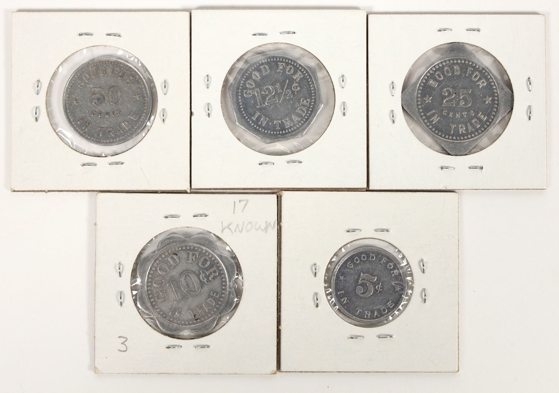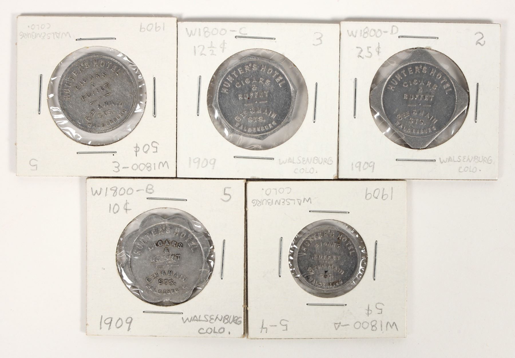 The whole five token set from the 1909 hotel and saloon: 1) HUNTER'S HOTEL / CIGARS / & / BUFFET / 6TH & MAIN / STS. / WALSENBURG // GOOD FOR / 5c / IN TRADE; Al., rd., 21 mm. 2) HUNTER'S HOTEL / CIGARS / & / BUFFET / 6TH & MAIN / STS. / WALSENBURG // GOOD FOR / 10c / IN TRADE; Al., Sc 8, 29 mm. 3) HUNTER'S HOTEL / CIGARS / & / BUFFET / 6TH & MAIN / STS. / WALSENBURG // GOOD FOR / 12¬Ωc / IN TRADE; Al., octagonal, 24 mm. 4) HUNTER'S HOTEL / CIGARS / & / BUFFET / 6TH & MAIN / STS. / WALSENBURG