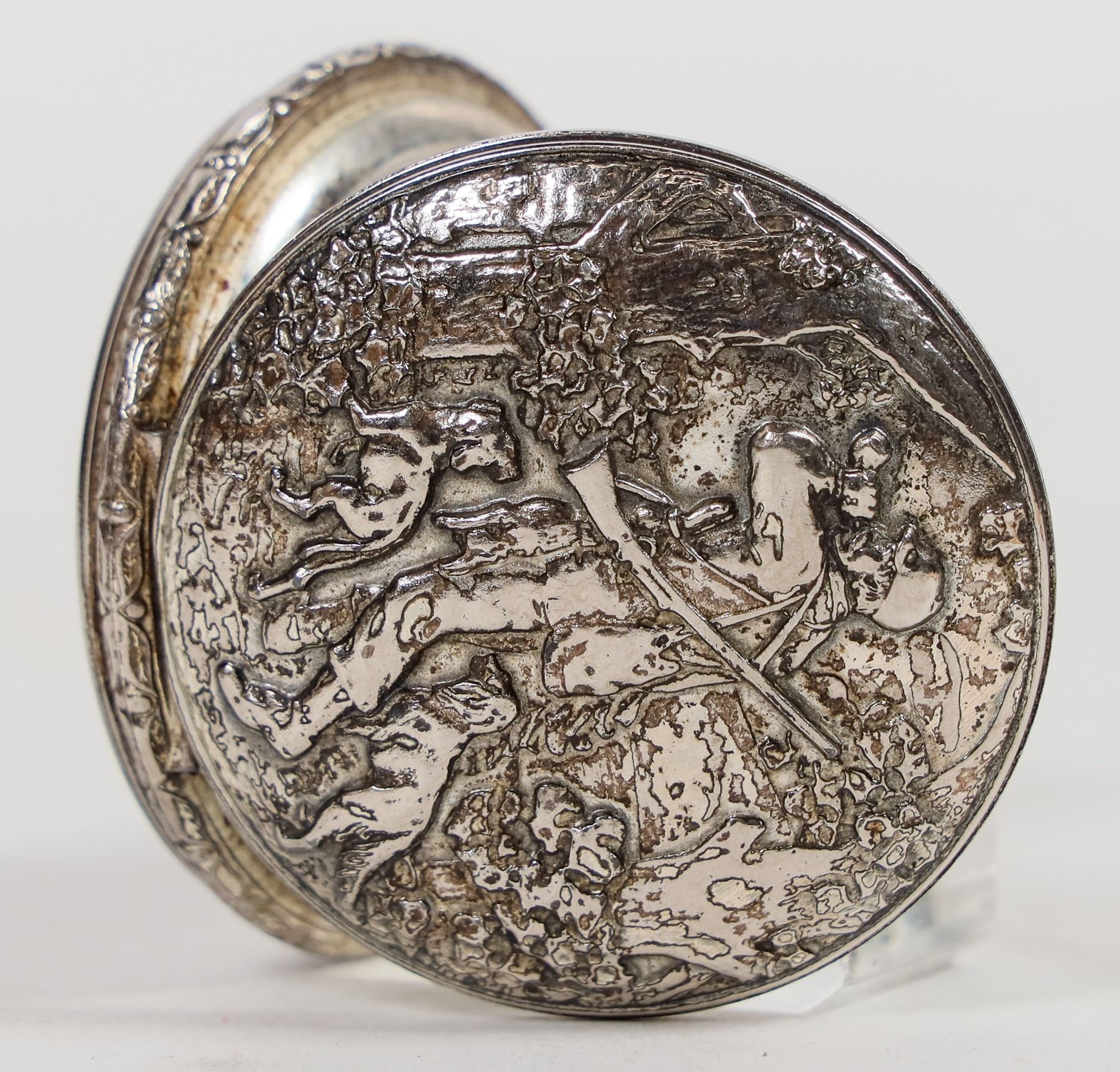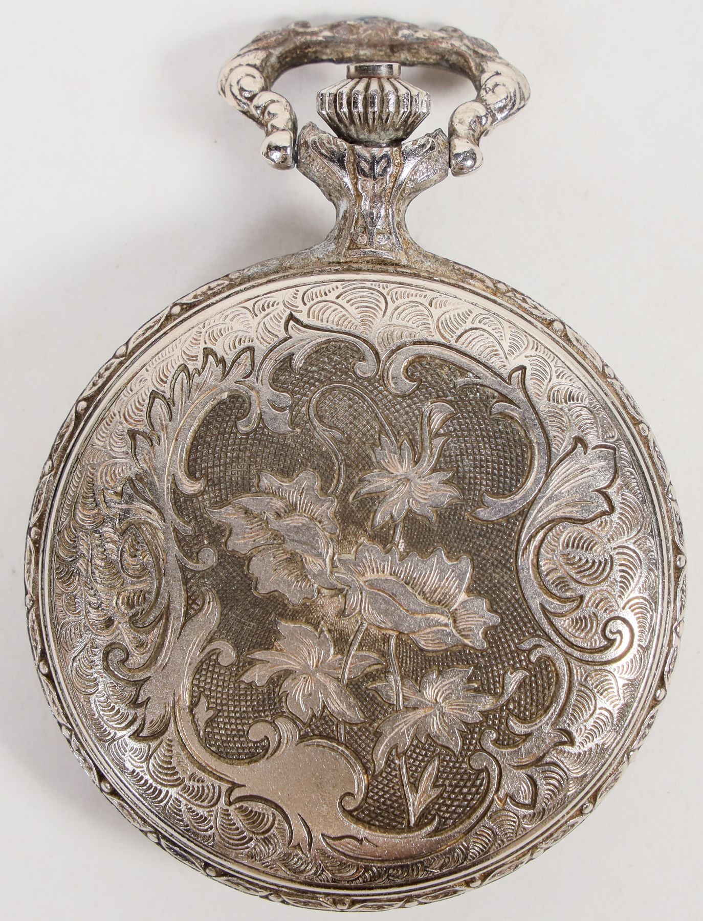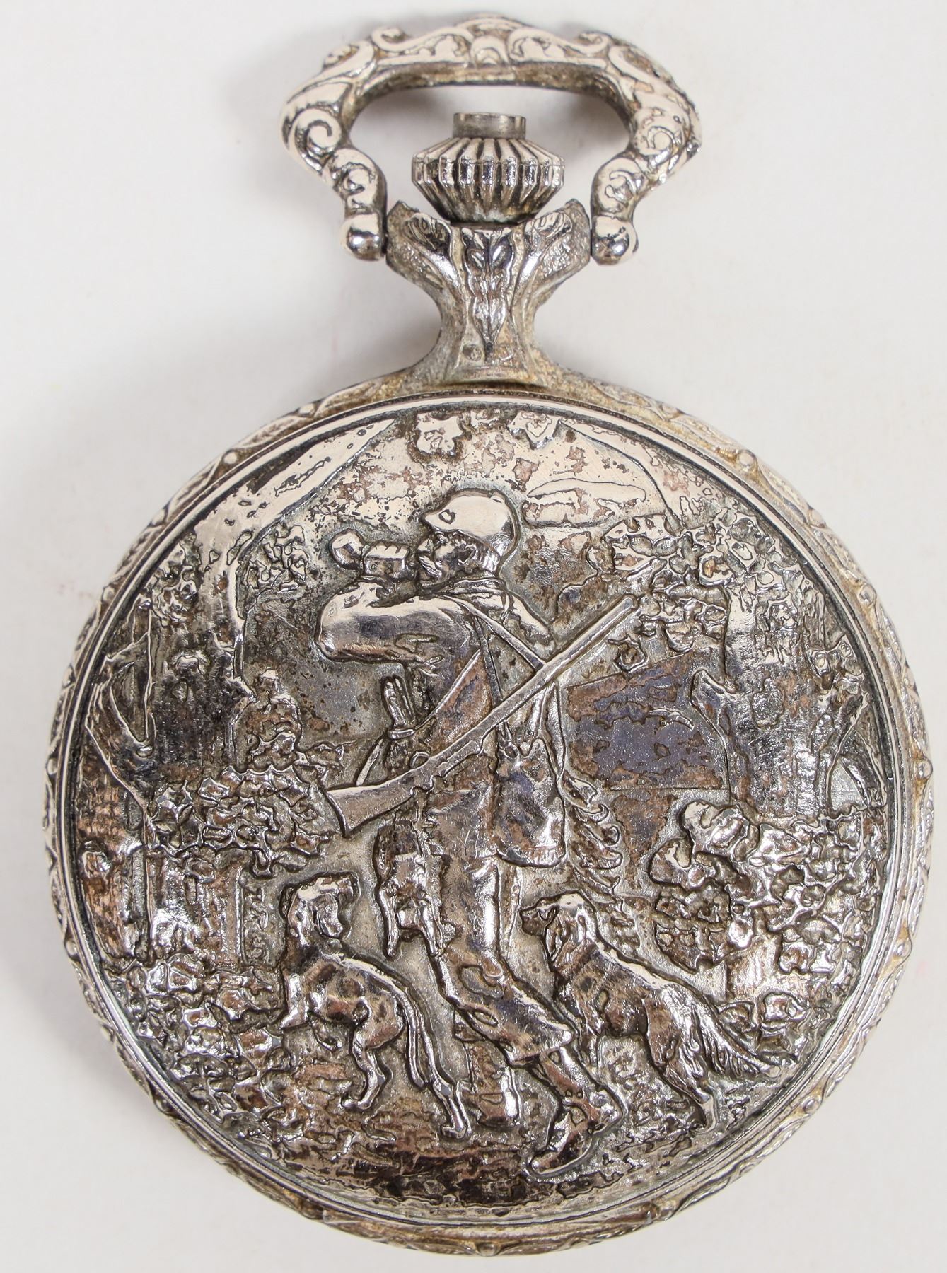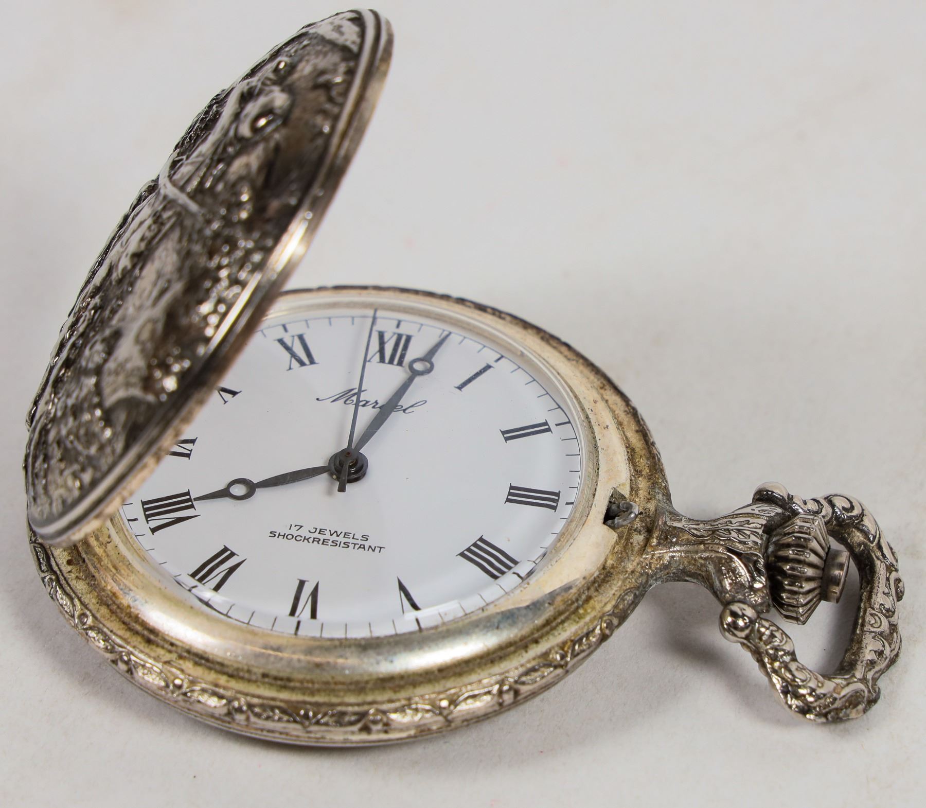 White metal case with relief scene of hunter with bugle and dogs. Marvel, 17 jewels "shock resistant".