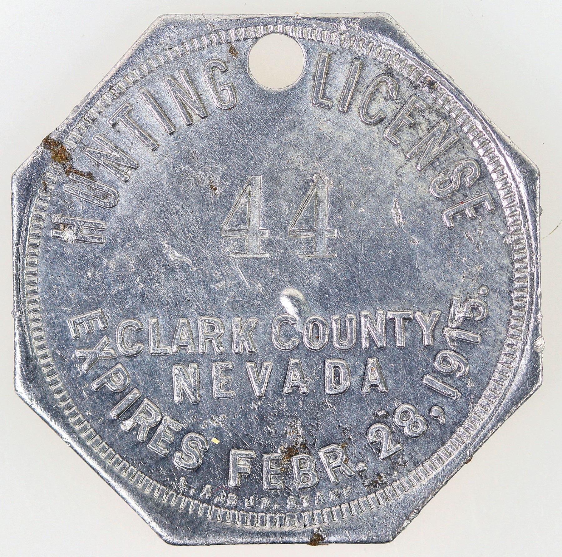 Hunting license for Clark County, Nevada issued in 1915. This specimen is in good condition with embossed letters having good contrast to the background. The finish is in good condition with only minor dents and scratches. See photo.