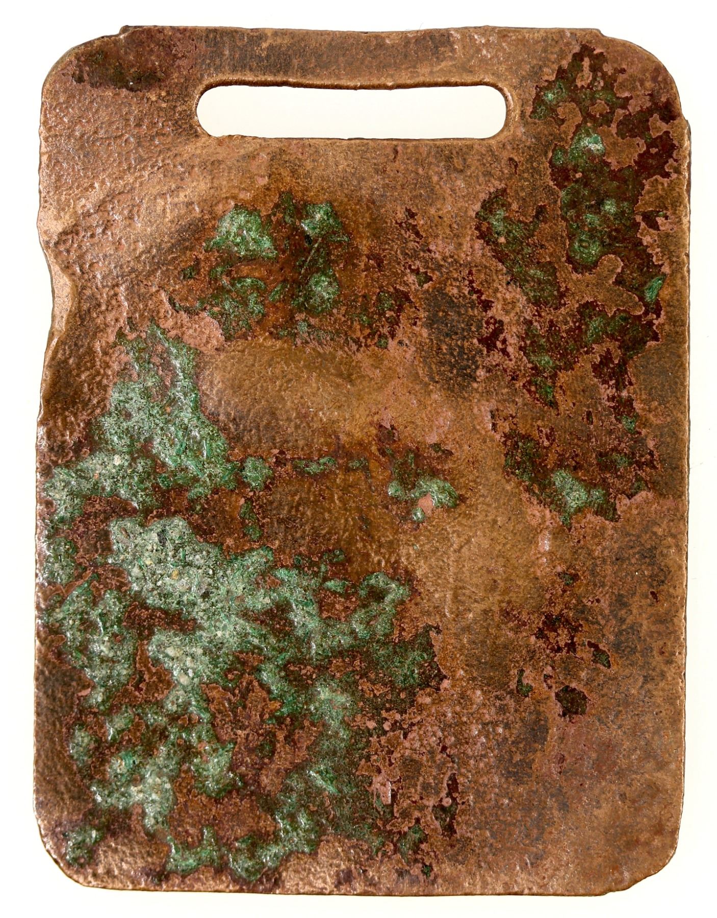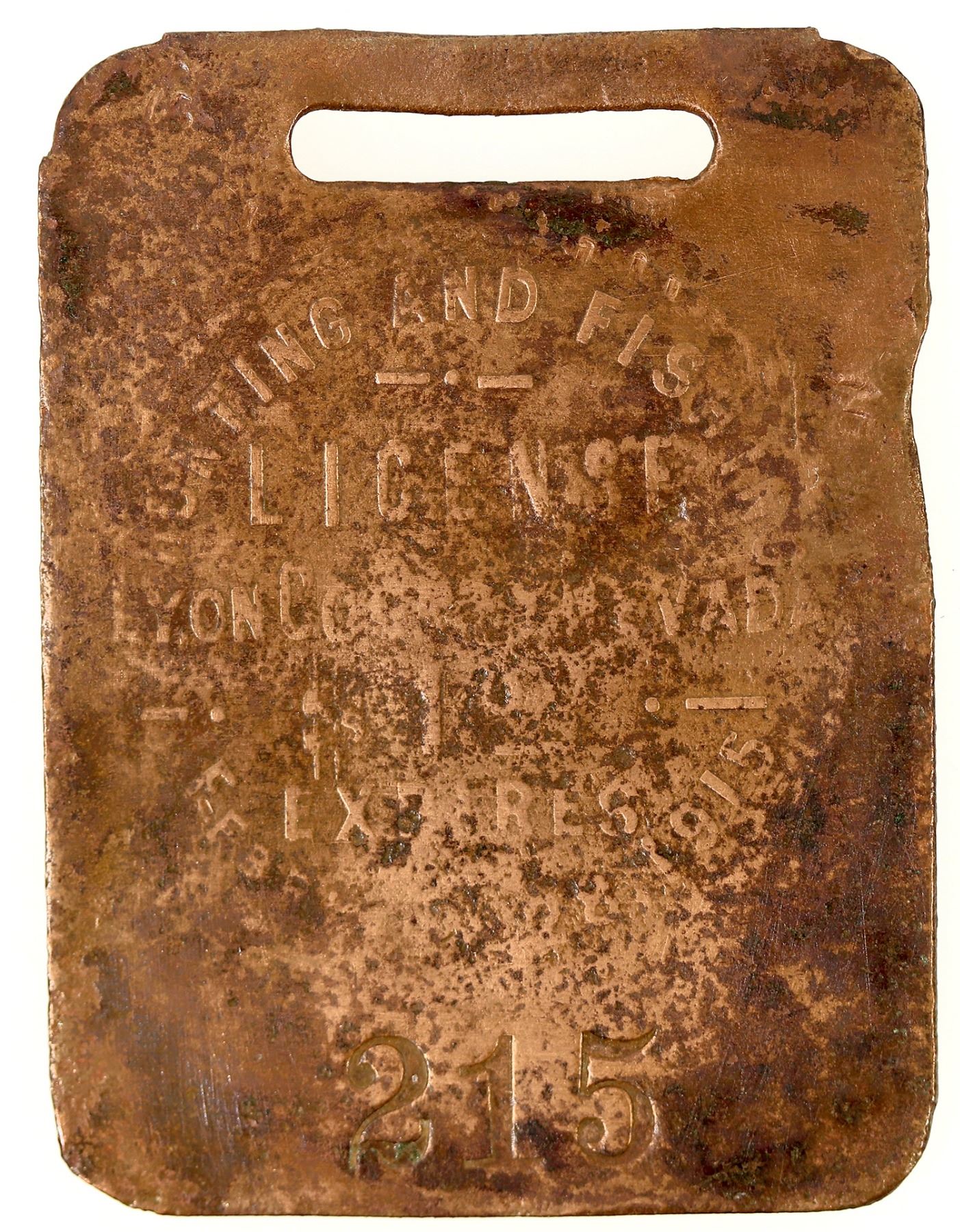 Hunting/fishing license for Lyon County, Nevada issued in 1915. This specimen is in good condition with legible text, though the plating is fading and rust is affecting the back. See photo.