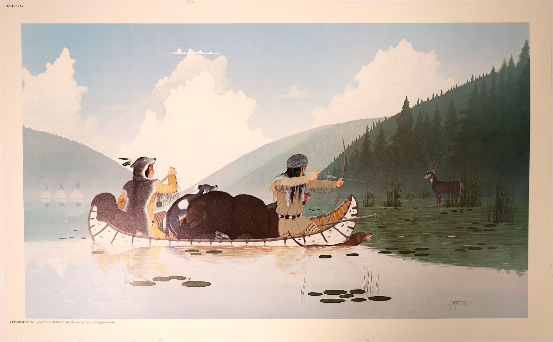Donald Vann print of two Native Americans in a canoe bow hunting, shooting a a deer. their dogs are with them and a dead bear in the canoe! Edition: 245/450.