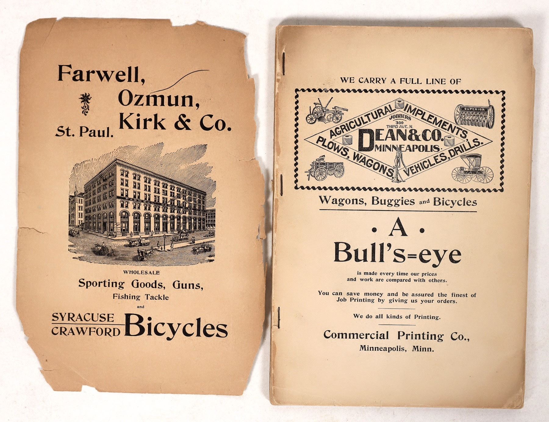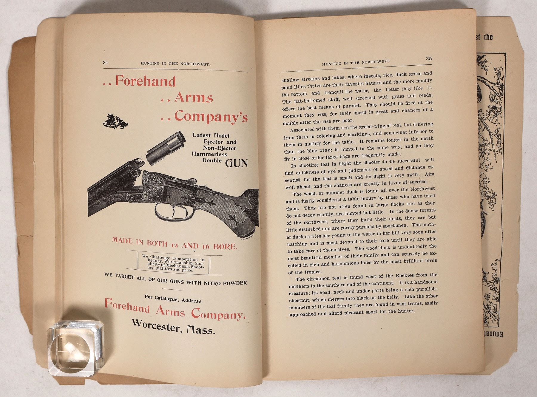 This is a paperback book "Hunting in the Northwest" compliments of Farwell, Ozmun, Kirk & Co. of St. Paul, Minn. edited by C. J. Blanchard at 144 pages. The year was 1896; read about shooting techniques, the proper load for black powder shotgun shells, the proper leads for ducks, the best made hammerless guns. The first chapter describes a healthy young man anxious to be in the woods or on the water of any lake. As an older man, all he has to do is reflect on the time spent in the woods or on the water in his youth. All of this at the onset of hunting regulations and the need for wildlife conservation; a new concept. The book outlines access to the Northwest states by railway with stops and available game at each. Minnesota had a three week deer hunting season with a limit of five deer per hunter. You want those days back again. 5.5 in. X 8.5 in. detached front and back cover, good condition.