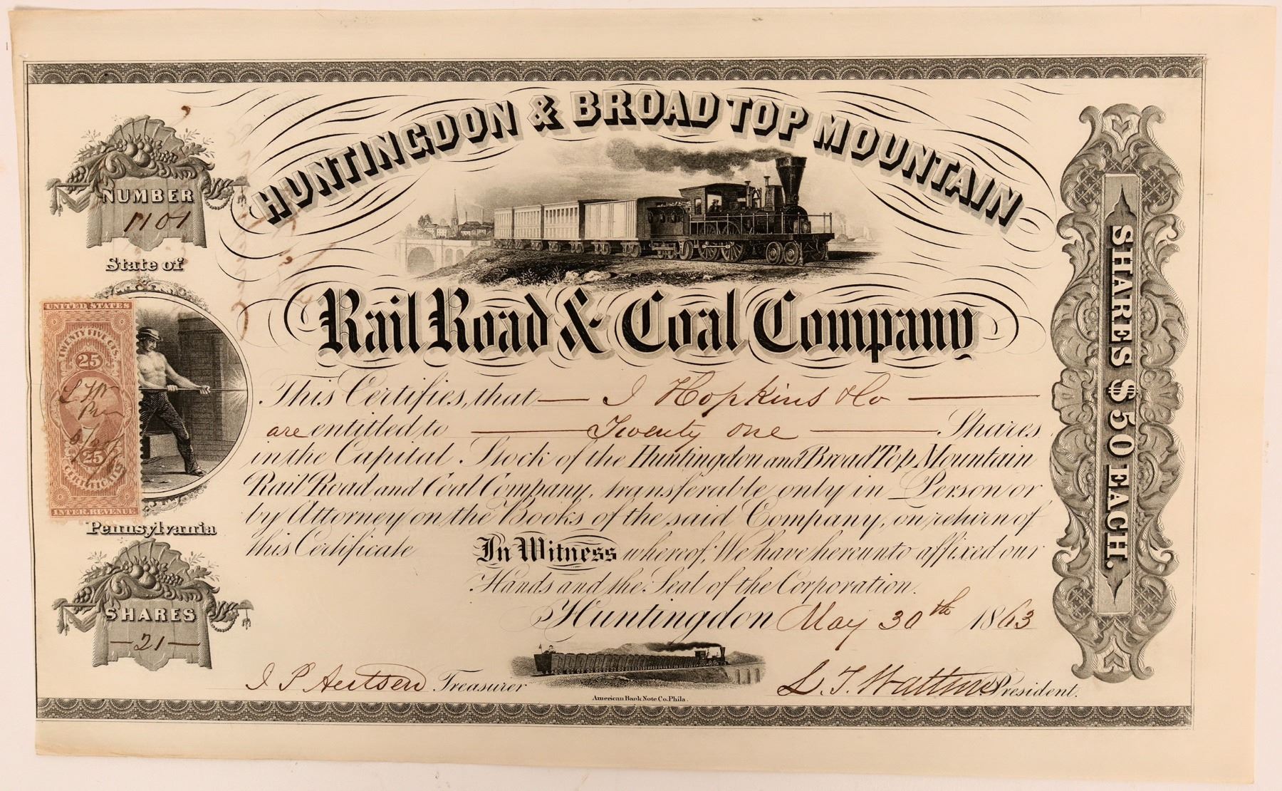 incorp. 1853 The purpose of the line was to provide a rail link from Huntingdon to Bedford, and to provide a competitive alternate route to local coal producers . #521, I/C, 2 shares @ $50 par issued July 27, 1855 signed L.T. Wattson President. Black, embossed seal w.center train, Vignettes: top train w.cars l-r, left iron worker, bottom coal train l-r from rear view. 25c revenue stamp left side. American Bank Note Co. printer. VF.