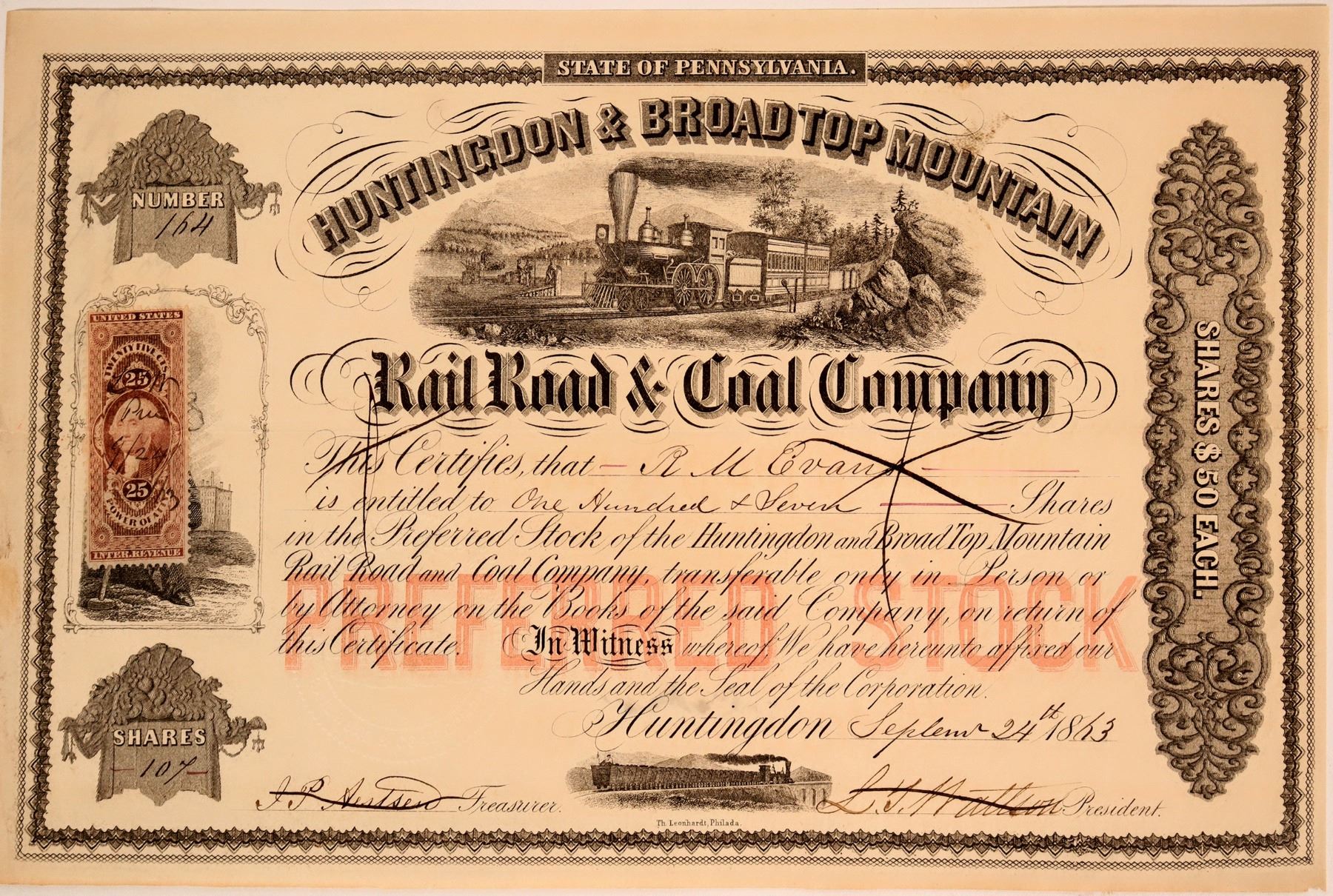 incorp. 1853 The purpose of the line was to provide a rail link from Huntingdon to Bedford, and to provide a competitive alternate route to local coal producers . #164, I/C, 107 shares @ $50 par issuedSept 24, 1863 signed L.T. Wattson President. Black, embossed seal w.center train, Vignettes: top train w.cars l-r, left iron worker, bottom coal train l-r from rear view. 25c revenue stamp left side. The Leonhardt Co. printer. VF.
