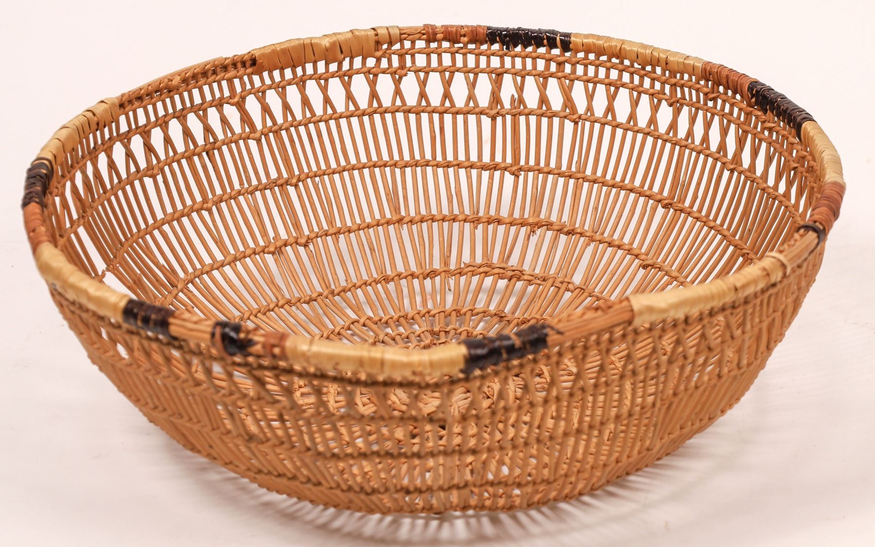 Vintage open-twined, Northern California Hupa/Yurok sifting basket used to process food by winnowing grain, 11 inches in diameter x 4 inches tall. Basket is in very good condition with small (less than 10%) areas of rim weave missing, and less than one square inch of missing side sticks. See photo for details of design and construction. State:California City: Date: Provenance: