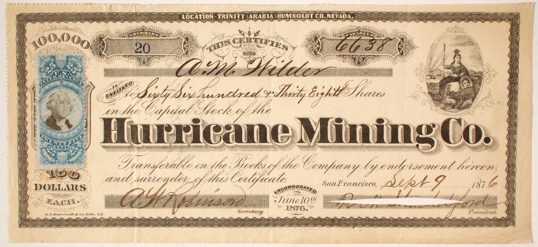 Cut cancelled president's name. 25c Blue Revenue Stamp. Very early # 20 issued to AM Wilder for 6,638 shares. (Wilder would be president of this company in 1877.) signed by RM Shankelford(?) president. and secretary AW Robinson. Incorporated in California 1876. Vignette at upper right corner of a variation of the California state seal. Printer: Bancroft. Black border on cream paper. Location Trinity (Arabia), Humboldt Co, Nevada printed at top. The Arabia district was discovered by George Lovelock in 1859 and was one of Nevada's first organized mining districts. It was originally in Humboldt Co. The first big mine there was the Montezuma. The district produced about $1 million according to Lincoln, but was omitted by Couch & Carpenter. Not in Burchard or Raymond. Very fine except for cut cancel. State: Nevada City: Arabia District, Humboldt County Date: 1876 HWAC# 85266