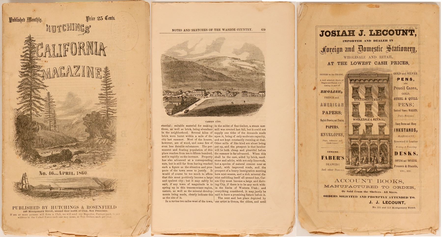 Hutchings' California Magazine, No. 46, April 1860. Published by Hutchings & Rosenfield, SF. Vol. IV, No. 10. Opens with an article "Notes and Sketches of the Washoe Country" which has birds-eye views of Virginia City, Genoa, and Carson City, which FH notes is the 1st published view. Also has articles about the Laws of the Flowery Mining District, California Wildflowers, and more! About 50 pp. with illustrations. 10 x 6" Rough edges, wear to covers, etc.