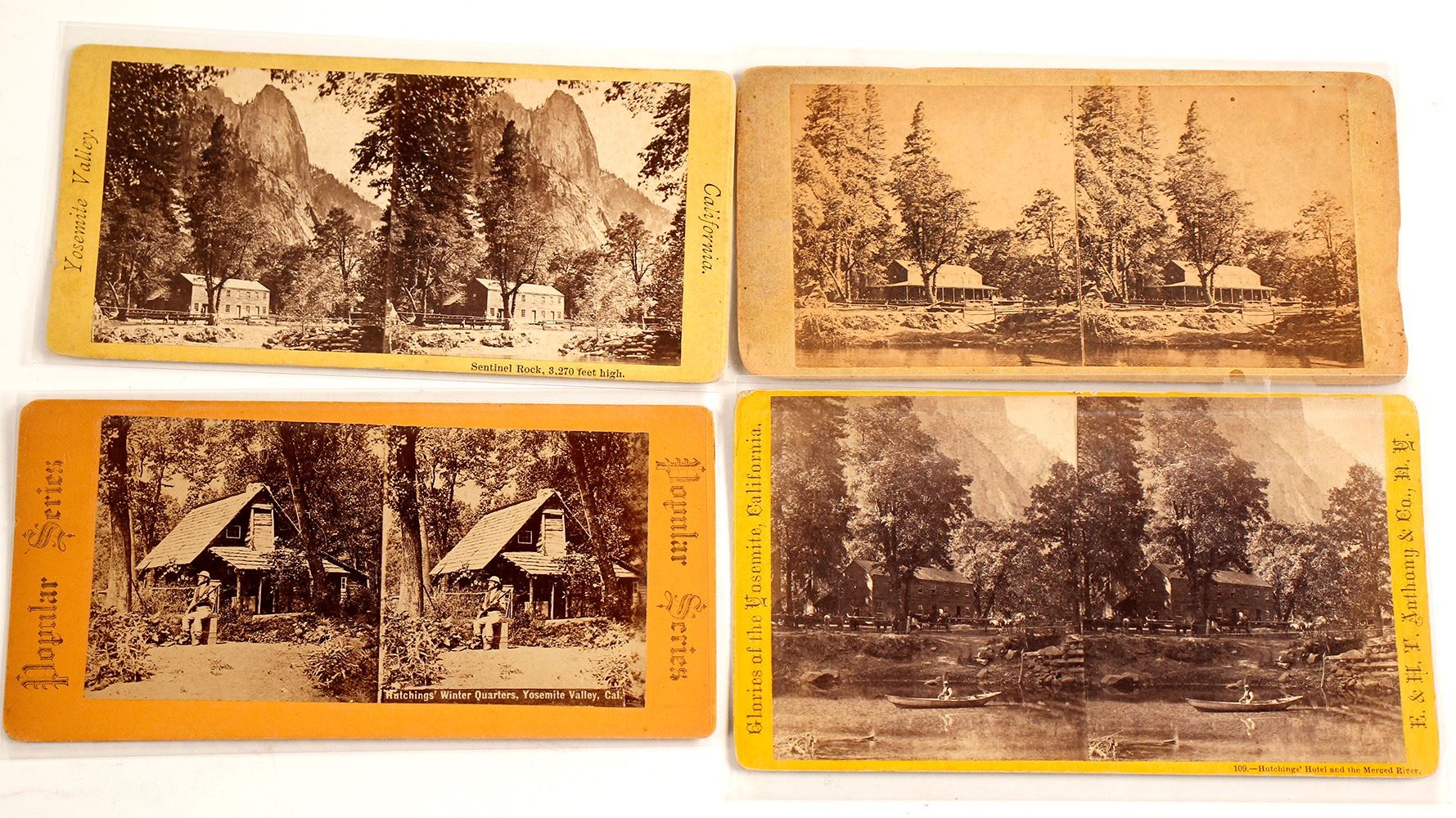 Lot of 4 different for this iconic hotel located in Yosemite. 1) Best is E.&H.T. Anthony & Co. stereoview No. 109 which shows hotel and man in canoe in foreground. Great detail. 2) Rare Popular Series stereoview showing Hutchings' Winter Quarters (man in front of cabin with rifle). 3) Two others, no publishers, one poor condition. (Prag Collection) Date: Location: Yosemite, California HWAC# 54784