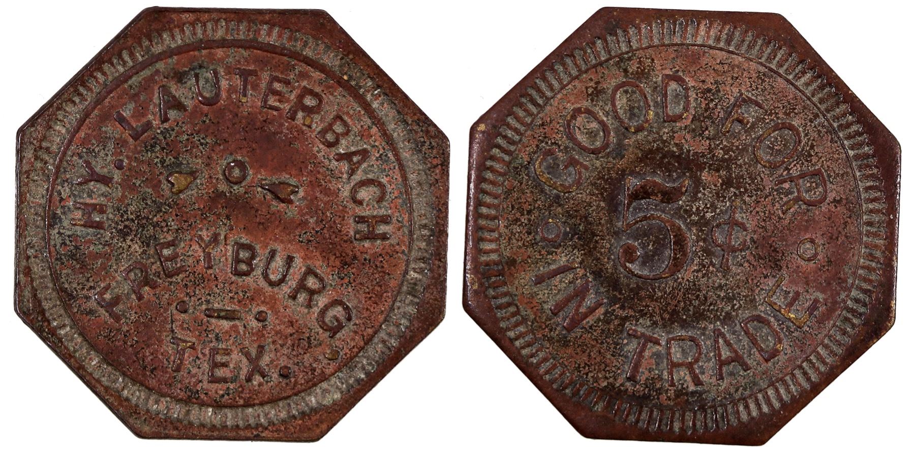 Fayette County token: HY. LAUTERBACH / FREYBURG, / TEX. // GOOD FOR / 5¢ / IN TRADE; Br., octagonal, 20 mm.