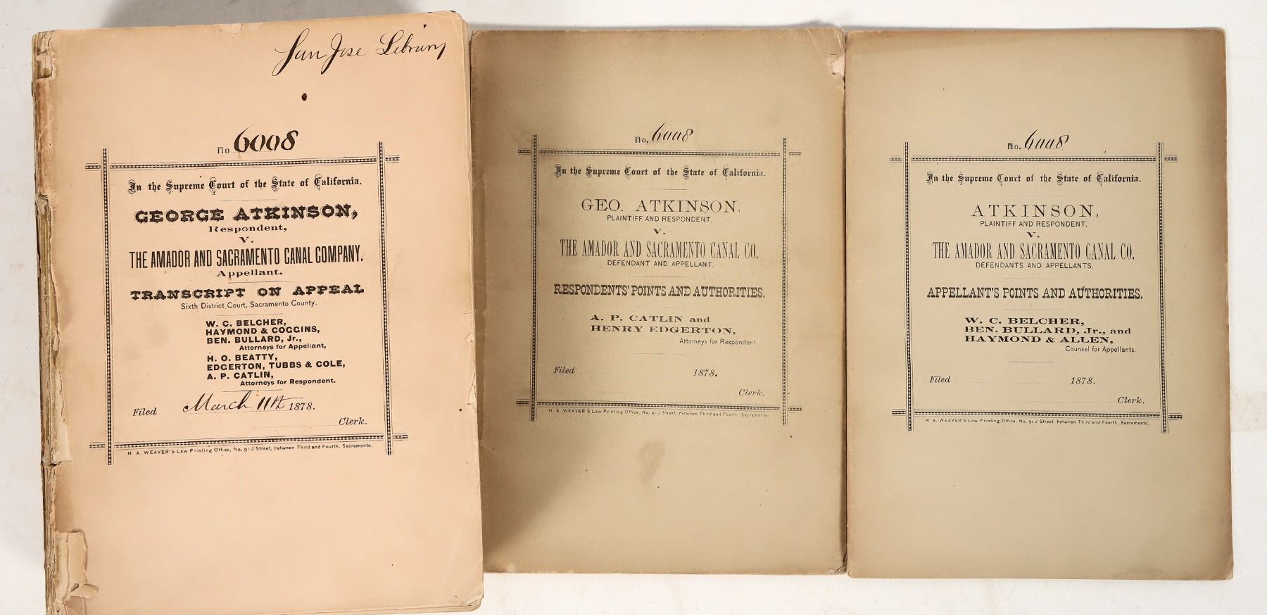 Large volume and accompanying published brief regarding George Atkinson vs Amador and Sacramento Canal Co., an 1870s lawsuit. This suit involves an approximate 120 acre farm/ranch established in 1859, and sold or transferred twice up to 1870. In the early 1870's, The Amador and Sacramento Canal Co. or water lessors thereof, began hydraulic mining on ground significantly higher in elevation, draining through Arkansas Creek, a tributary to the Consumnes River. The massive flow of hydraulic mining flooded and covered Atkinson's land making it unusable. This case is a classic case that led to the outlawing of hydraulic mining. One volume of pleadings, evidence, etc. is dated 1878, and is 4" thick with no binding; accompanied by two similarly dated smaller pleadings. Excellent research material.