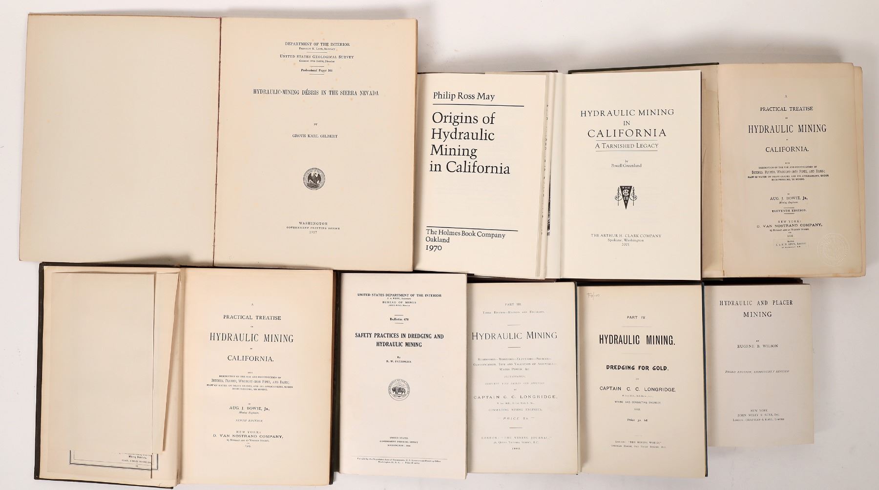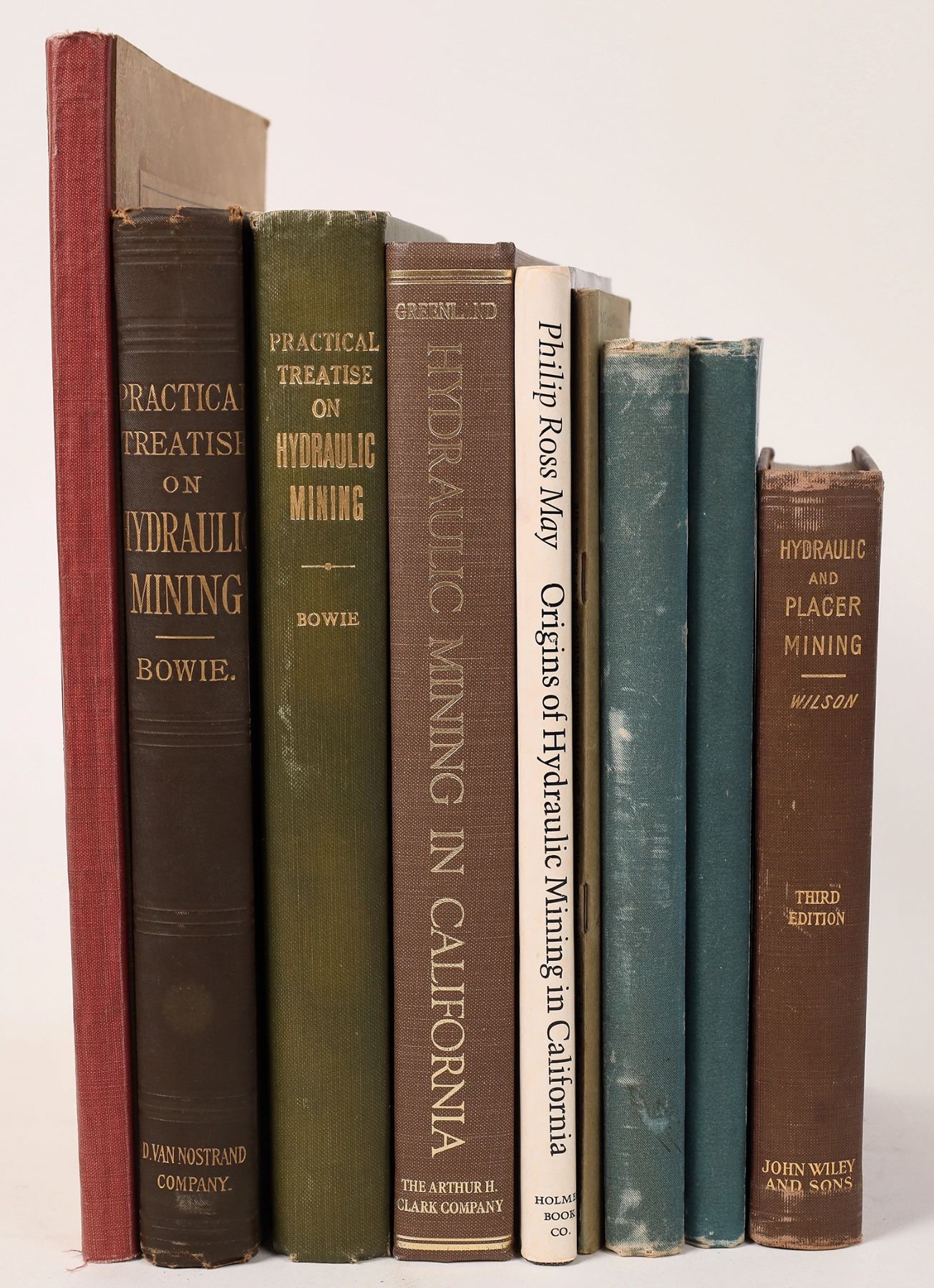 9 hydraulic mining references. Practical Treatise on Hydraulic Mining by Bowie, 1905 and 1910, foldout 1905 Sacramento River map.Hydraulic Mining in California by Greenland, 2001. Safety Practices in Dredging and Hydraulic Mining,1948. Hydraulic Mining by Longridge, 1902. Hydraulic Mining Dredging for Gold by Longridge, 1901. Origins of Hydraulic Mining in California by May, 1970. Hydraulic and Placer Mining by Wilson, 1918. Hydraulic Mining Debris in the Sierra Nevada by Gilbert, 1917. GO TO THE BOOKS SECTION OF THIS AUCTION FOR OTHER IMPORTANT MINING REFERENCES AND MINING-RELATED WORKS.