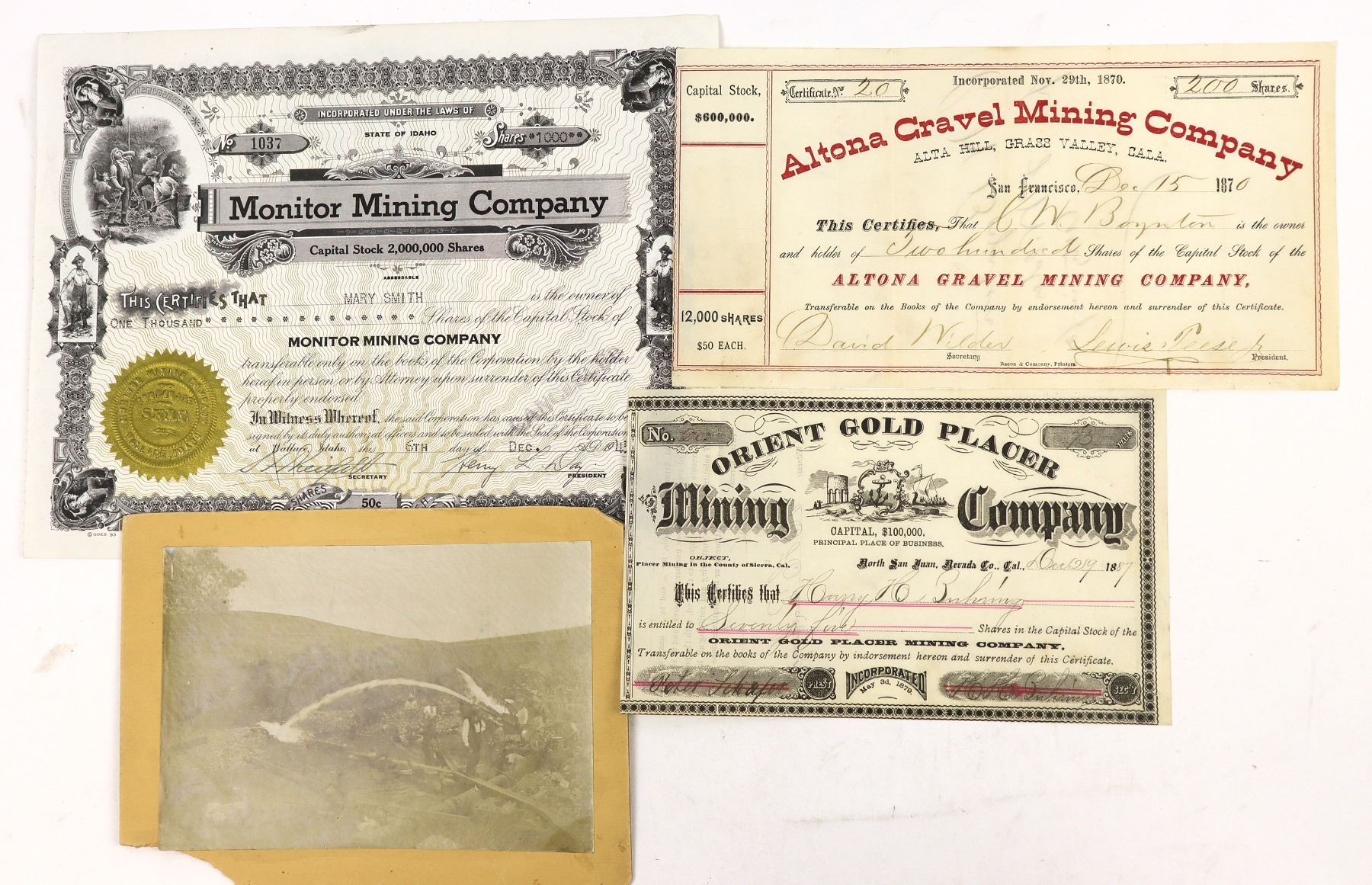 Lot of 4. 1) Altona Gravel Mining Company. Alta Hill, Grass Valley, Cala. (printed under title). No. 20, issued for 200 shares to CW Boynton on Dec. 15, 1870 in San Francisco. Signed by president Lewis Teese and secretary David Wilder. Not cancelled. Black and red print. Folds, toning. 5.25 x 10" 2) Orient Gold Placer Mining Company. "Placer Mining in the County of Sierra, Cal." (printed under title). No. 20, issued for 75 shares to company secretary Harry H. Buhring in Dec. 1887 in North San Juan, Nevada Co. Signed by Buhring and the president, Peter Schafer. Not cancelled. Black border and print, allegorical vignette. Border trimmed tight. 5 x 8" 3) Monitor Mining Company. Inc. in Idaho. No. 1037, issued for 1,000 shares in 1945. Stamp cancelled. Mining vignettes. Folds. Properties in the Sunset Peak region north of Wallace. 4) Mounted photograph of miners using water cannons. Reverse is labelled "Doty Ravine." 4.5 x 6.5" on 5.75x 7.75" mount with bottom left corner missing. Doty Ravine is located north of Lincoln, California. California 1870-1945