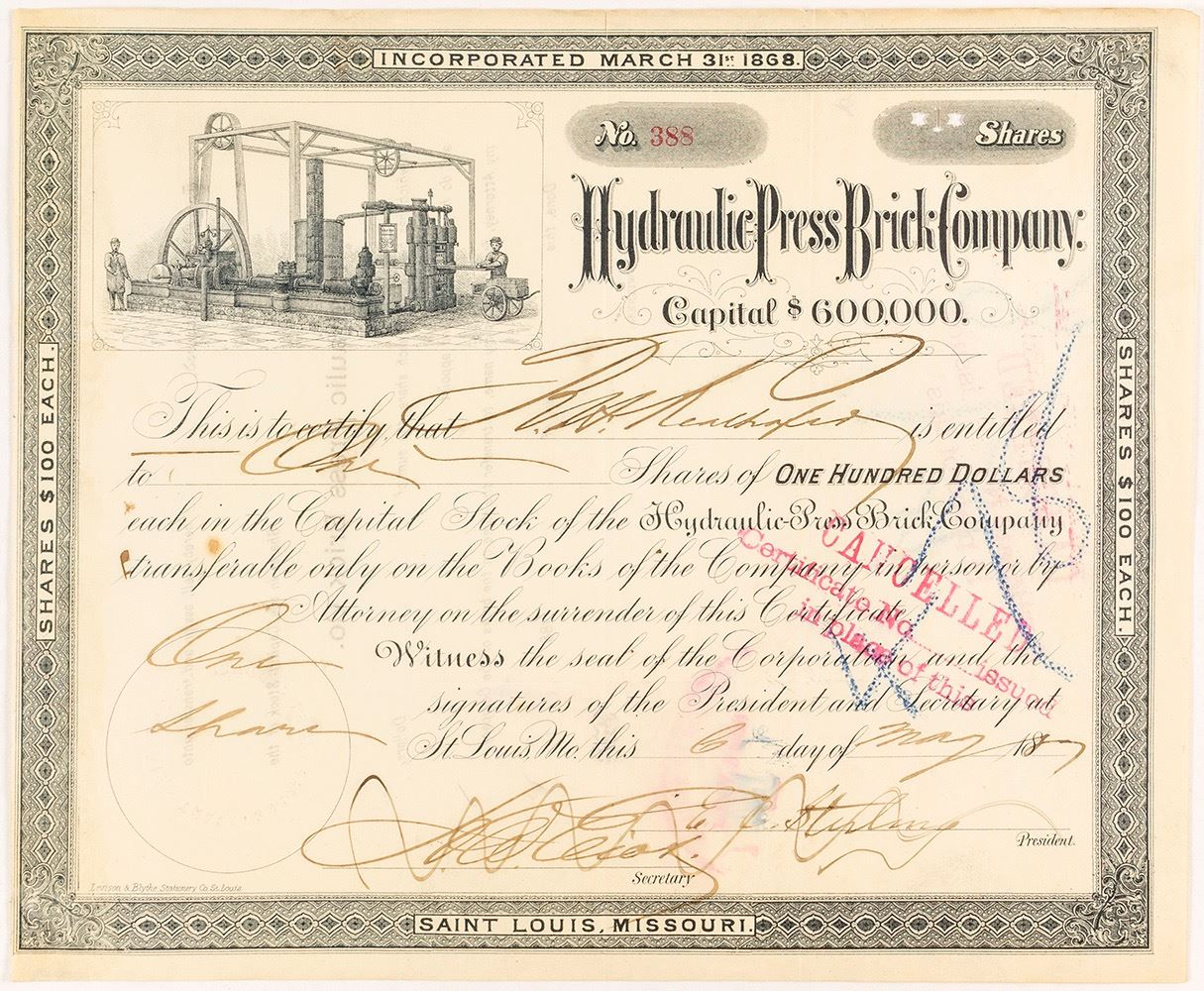Issued in 1887 (?). Number 388 for 1 share for this innovative company. Signed by president EC Sterling. Vignette shows the working press. Many stock certificates can be found under this name, but none have the fantastic vignette of this one! Stamp cancelled. Some red and blue bleeding from another paper in bottom middle. Otherwise no rips, tears, pinholes, dog ears etc. The founder of the Hydraulic Press Brick Company, Mr. E. C. Sterling, developed the concept of molding dry clay with a hydraulic press. Mr. Sterling overcame many obstacles. Earlier attempts to utilize a dry clay manufacturing technique in the East had proven quite unsuccessful. He established his first operation in Memphis. In 1864, after the disruption of the Civil War, he relocated to St. Louis. Date: Location: St. Louis, Missouri HWAC # 54575