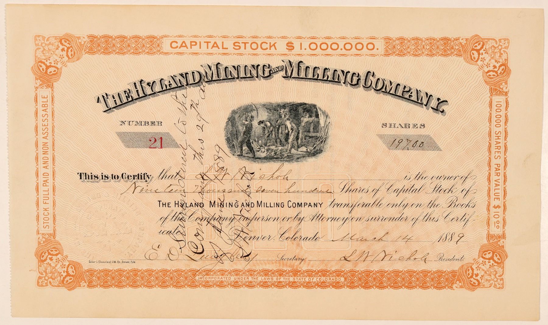 Inc. in Colorado. No. 21, issued for 19,700 shares to the company president, LW Nichols, on March 14th, 1889 in Denver. Signed by Nichols and the company secretary. Pen cancelled. Orange border and background. Small vignette of miners. Very clean. Printed by Collier & Cleaveland, Denver. 6.5 x 11" According to E&MJ, Vol. 83, the Hyland Mill was located at Idaho Springs in Clear Creek County. Not listed in Corregan & Lingane. No other information found. () Ken Prag Collection