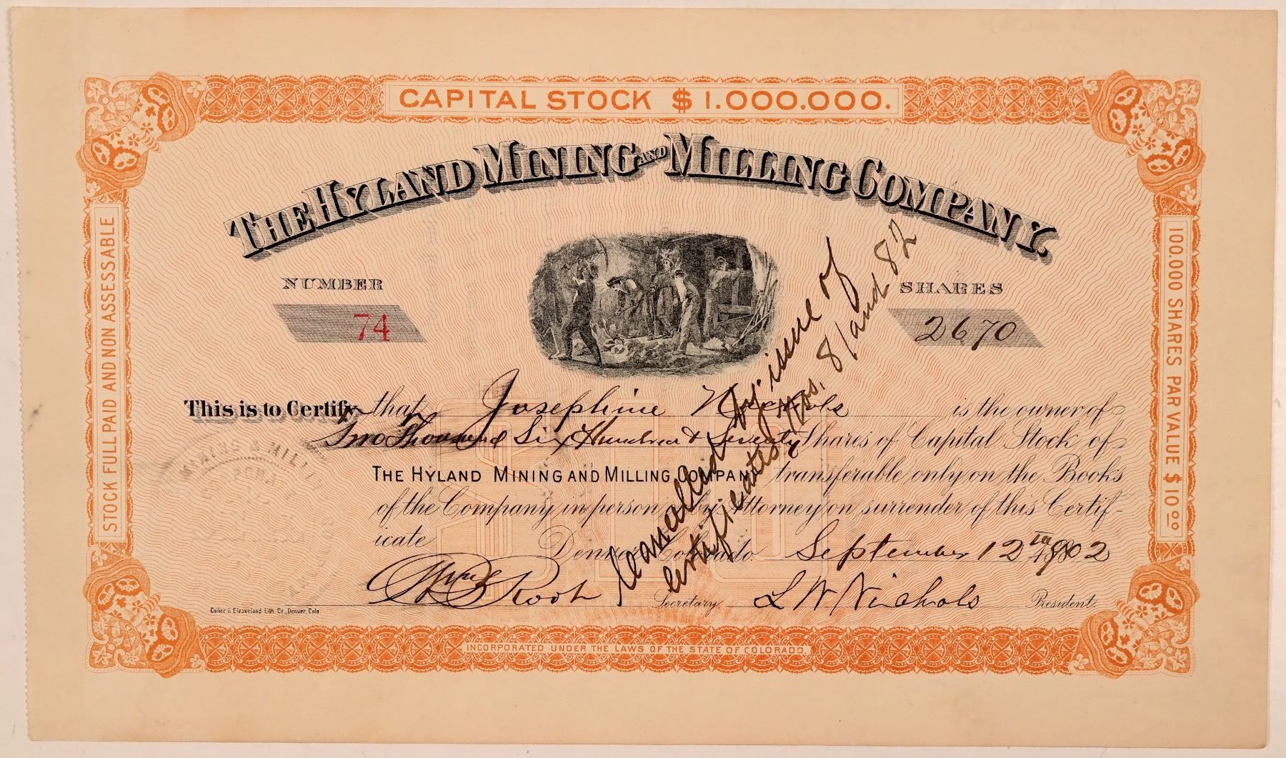 Incorp. Colorado. Number 74, I/C, for 2,670 shares to Josephine Nichols Sept 12, 1902 (handwritten over 188_) signed by president and brother L. W. Nichols and William Root. Orange, vignette top center miners working in tunnel, embossed corp. seal. Handwritten note cancellation due issuance of certificates # 8 & 82. Cailier & CLeaveland printer. Very nice condition.