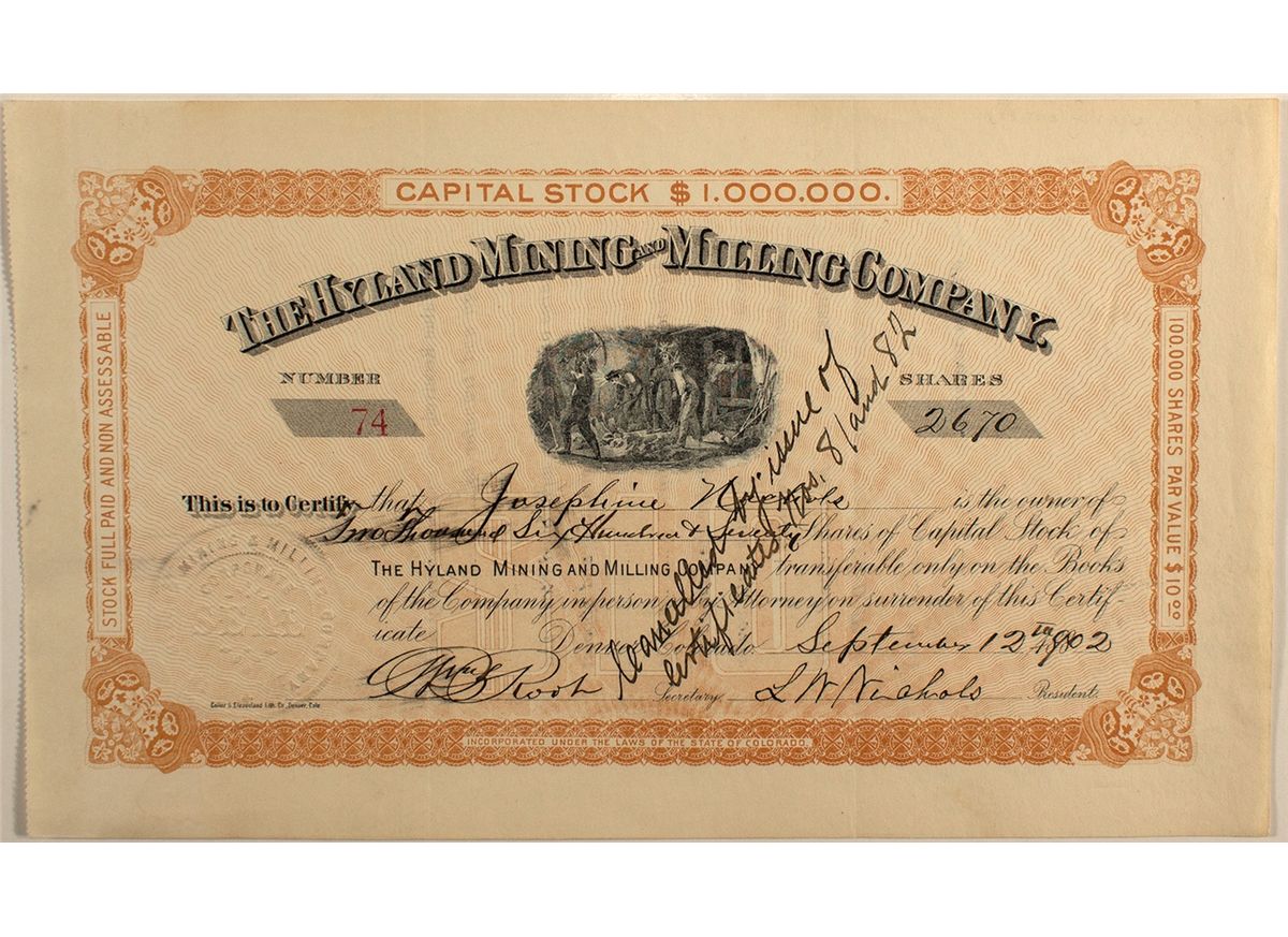 Number 74 for 2,670 shares to Josephine Nichols signed by president and brother L. W. Nichols and William Root.City: County: Clear CreekState: CODate: