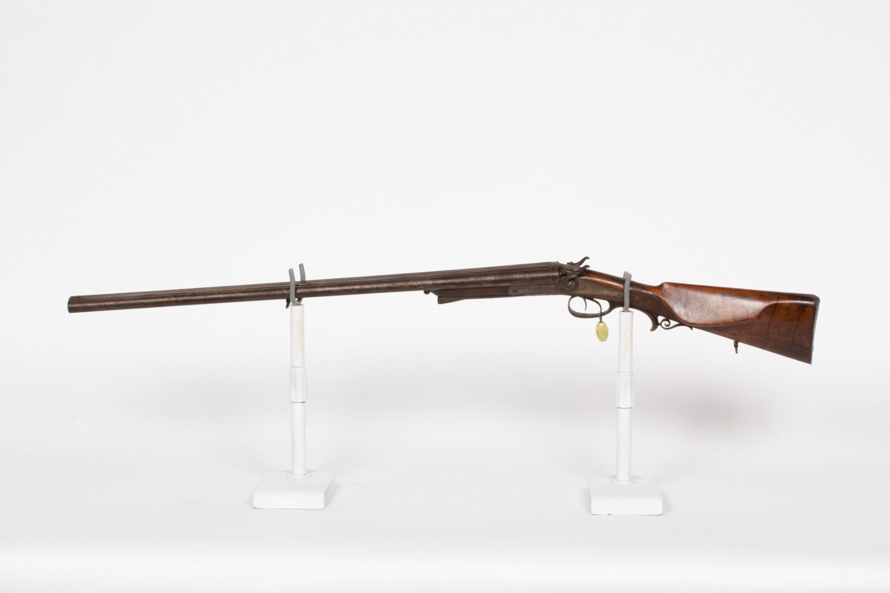 I. Ellert in Aschaffenburg gold lettering top barrel rib, 16-gauge, SxS, dual hammer, bead front sight, checkered fore and pistol grip on stock, some scroll work on trigger guard, steel butt plate SN: N/A, JMD Oval Tag: 7732, Condition: Good, >