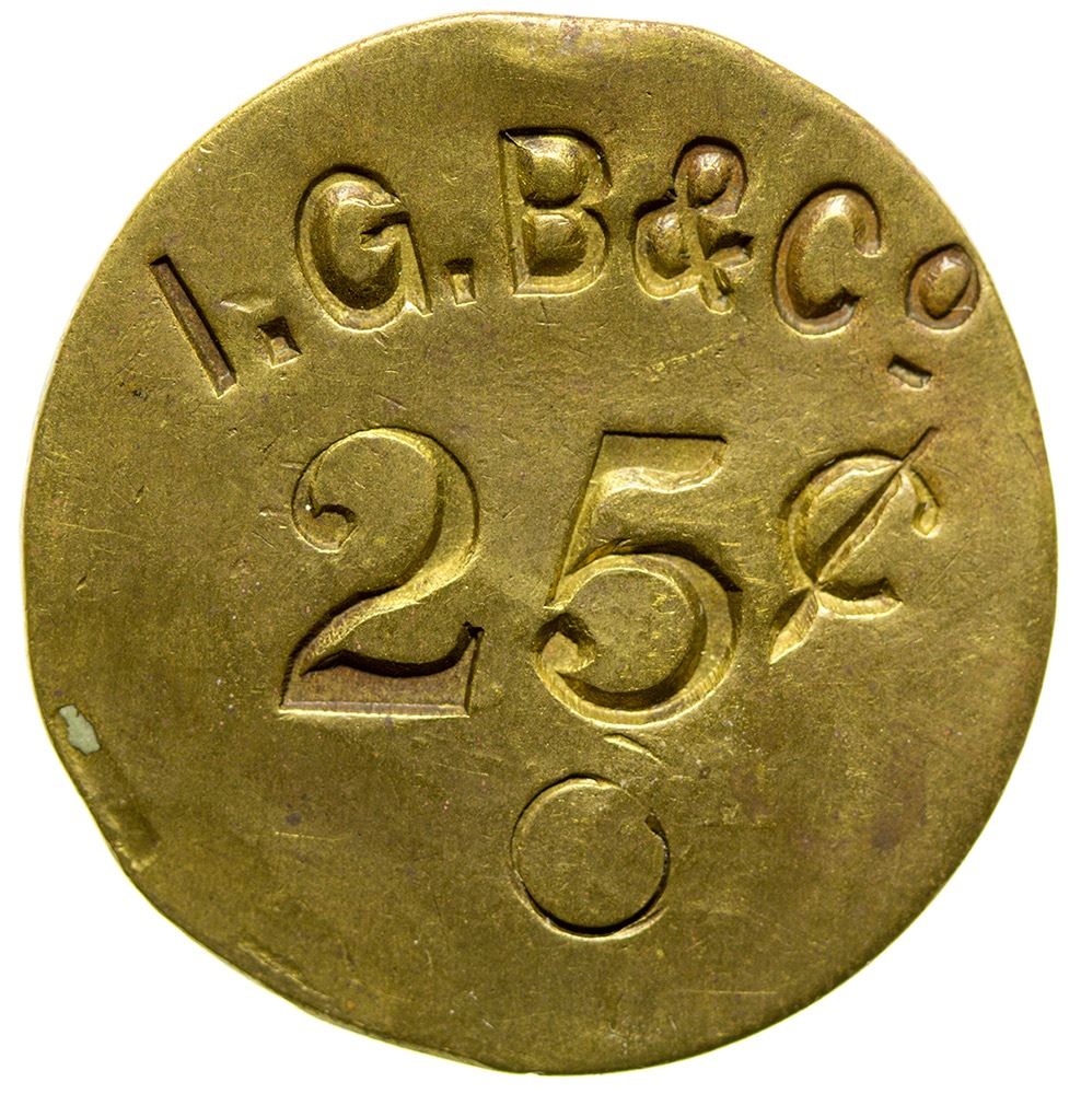 Extremely rare. I.G.B. & Co. / 25 c / O // (blank). Brass. Round. R12. 27mm. According to Murphy (1983), I.G. Baker & Co. held many important contracts, including supplying the Northwest Mounted Police in 1882, supplying beef to reservation Native Americans in Canada, and hauling mail between Ft. Benton and settlements in Western Canada. They were so powerful they beat out the famous Hudson Bay Company for contracts and over-stamped HBC tokens used in Indian trading. (Svoboda Collection) City: Fort Benton State: Montana Date: c. 1870-1877 HWAC# 33859