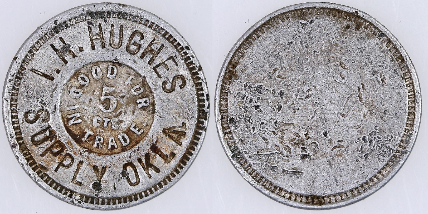 I.H. HUGHES (incuse) / GOOD FOR / 5 / CTS / IN TRADE. / SUPPLY, OKLA. (incuse) // (blank); Al., rd., 24 mm.