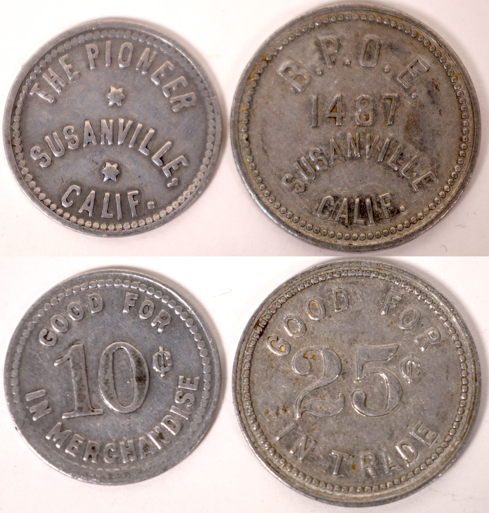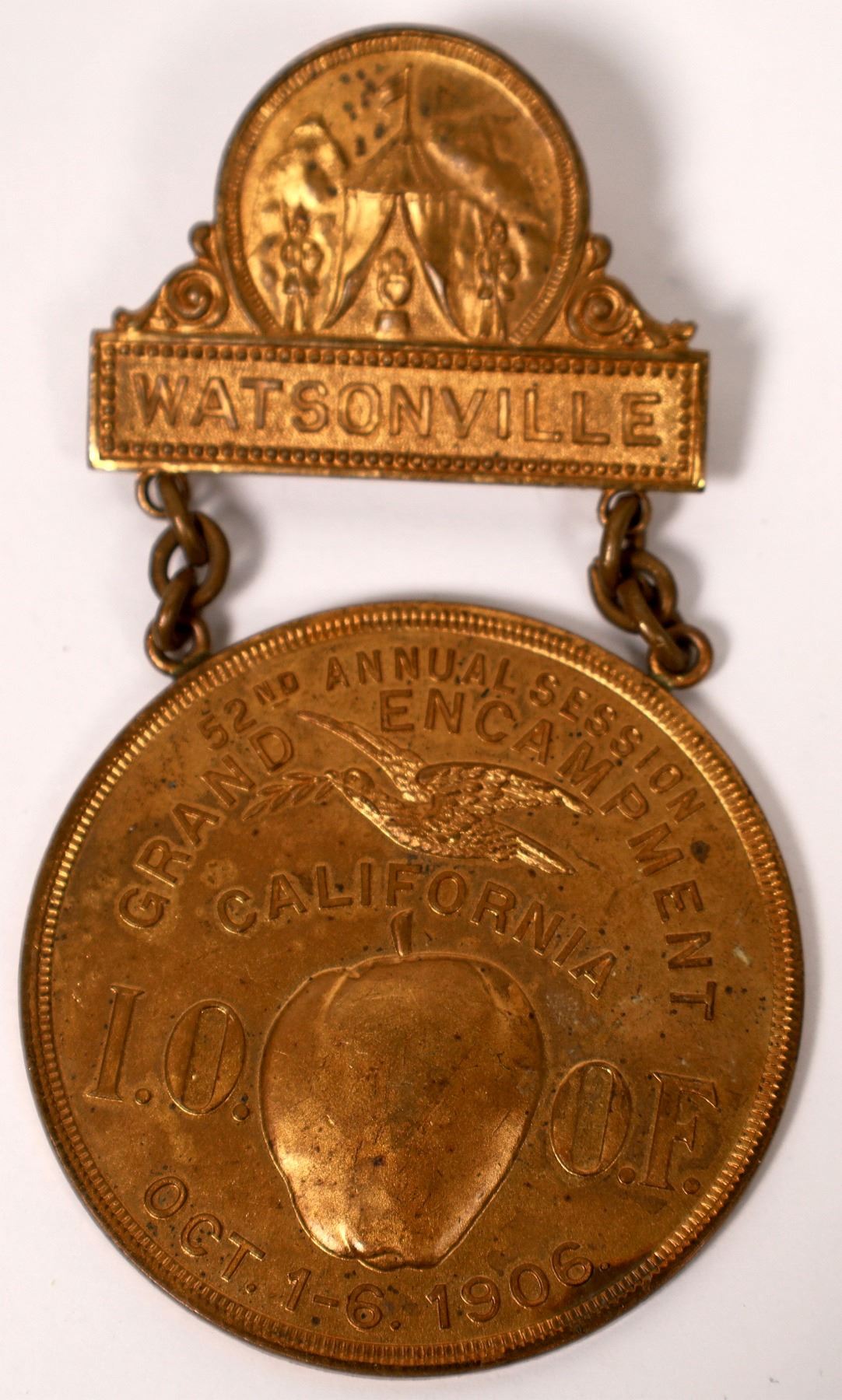 Lot of 3. 1. Brass Pin back badge “WATSONVILLE” nameplate w/51mm round “52nd Annual Session, Grand Encampment, dove w/olive branch, I.O. Embossed apple O.F. Oct 1-6, 1906. 2. Two tokens: Wht MetalThe Pioneer * Susanville */Calif// GF/10C/IM. Wht Metal, B.P.O.E/1487/Susanville/ Calif//GF/25c/IT.. Excellent condition.