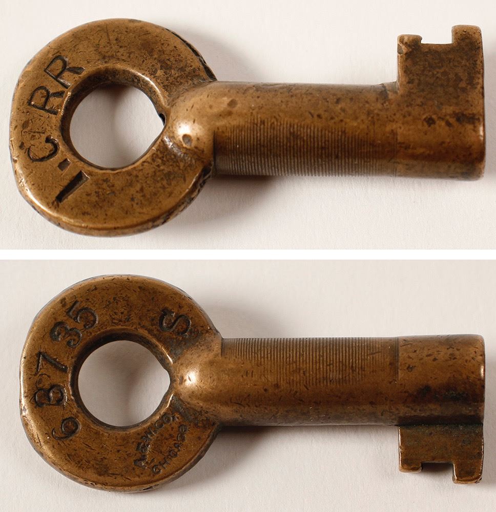 IC RR brass railroad switch key #63735 with manufacturer's stamp Adams & Westlake (oval marking). From carrier Illinois Central Railroad that operated 1852-1972. Key dates from period 1905 to 1920 Date: Location: HWAC# 571935
