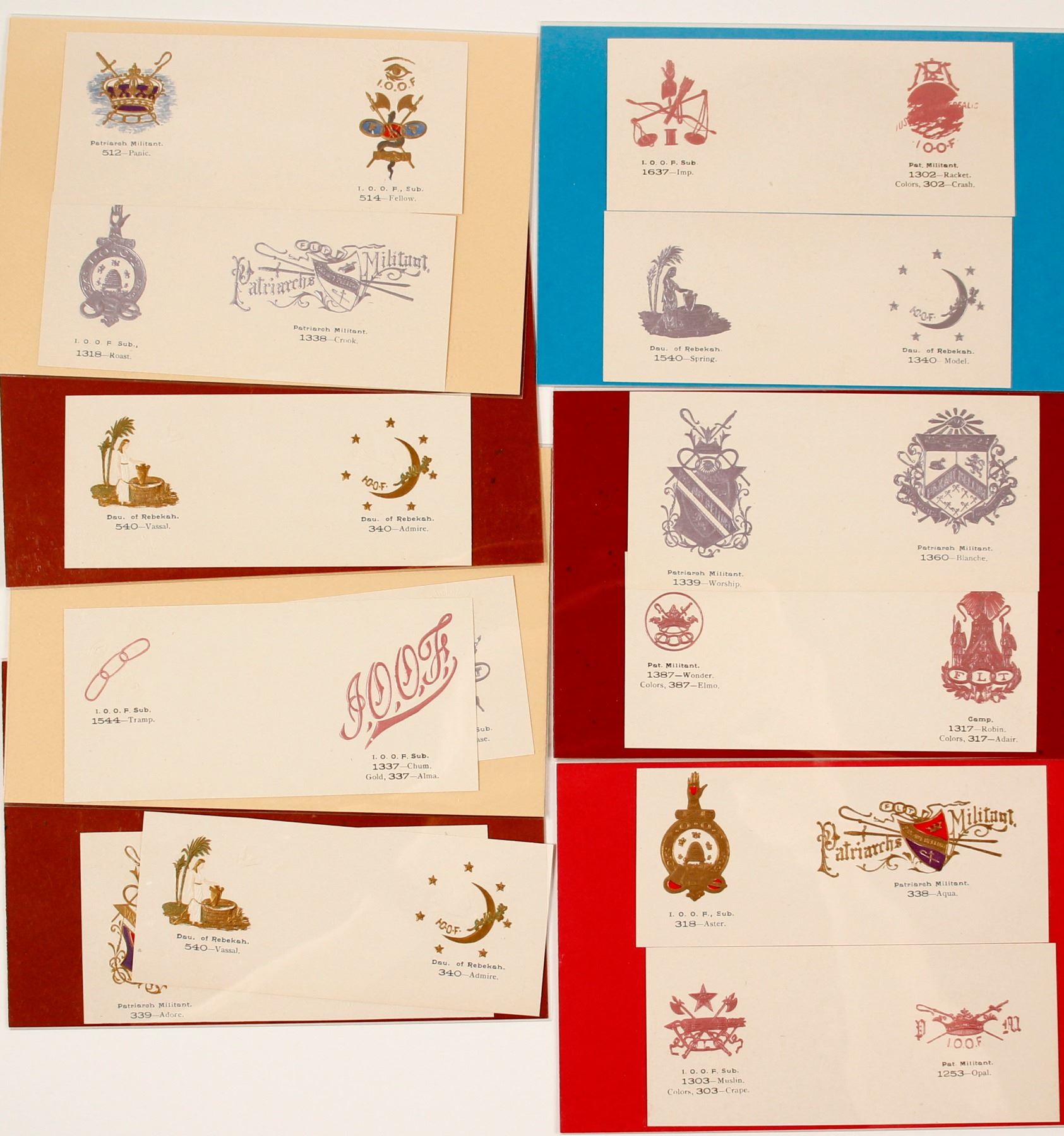 Lot of 13 color engravers and printers samplers for IOOF calling cards. Many are gilt. Two samples per block, 13 blocks. Blocks are 2 x 4.5" No printer listed. Attractive group!