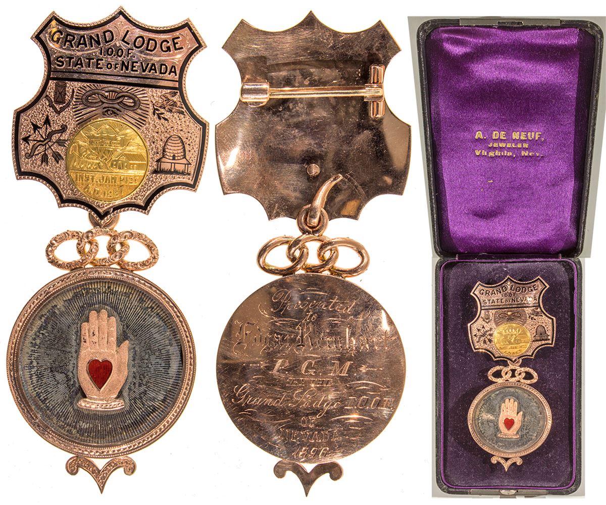 WOW! Just look at the photo to catch all the nuances of this piece: rose gold, red heart, gold circle insert, In an original case that is from A. De Neuf, jeweler, Virginia City. Leather cover and deep purple velvet interior. "Grand Lodge / IOOF / State of Nevada" on badge. Gold circle says "Inst. Jan 21st A.D. 1867." Reverse of badge says Presented to Edgar Reinhart, P. G. M., Grand Lodge IOOF of Nevada, 1896." De Neuf was a Virginia City jeweler from approximately 1889 to 1909.