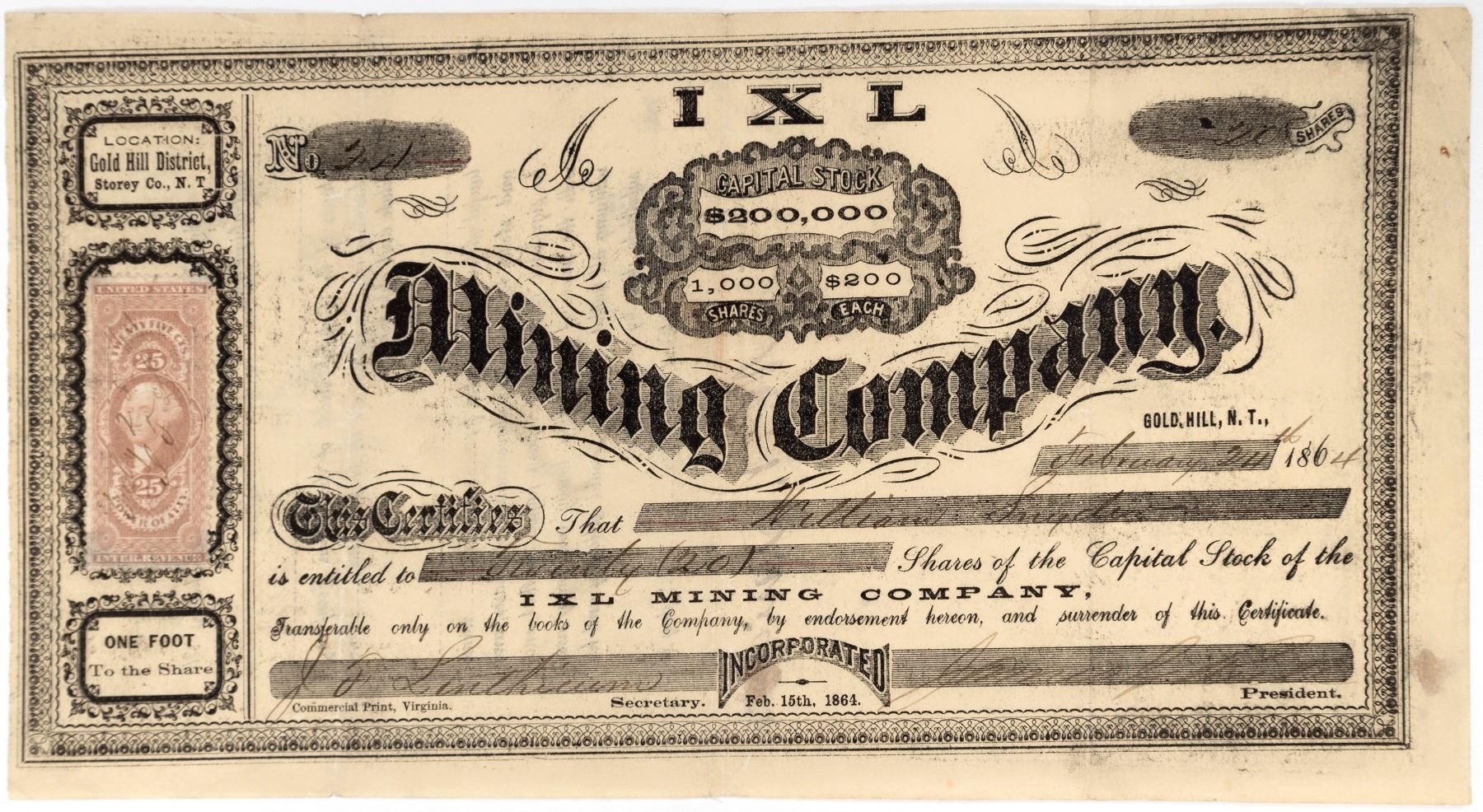 # 24 for 20 shares to William Snyder. Signed by secretary J. F. Linthicum and president James G. Rule. Dateline Gold Hill, N. T., February 24, 1864. Incorporated February 15, 1864. 25c Power of Att'y revenue stamp. Not cancelled. Location: Gold Hill District, Storey Co., N. T. Printed by Commercial Print in Virginia (City). One foot to the share. Very small holes along one fold. Dog ear upper right. Nicks on edges. Good Condition. Although we could find little information on the I X L (there were many to choose from), James G. Rule was an important mining man. He once sued James Fair for nearly $100,000 in 1885 ñ a sum of millions today. He also played a minor part in the great Sierra Nevada Mining Scam of 1878. (More historical notes on Rule included.)