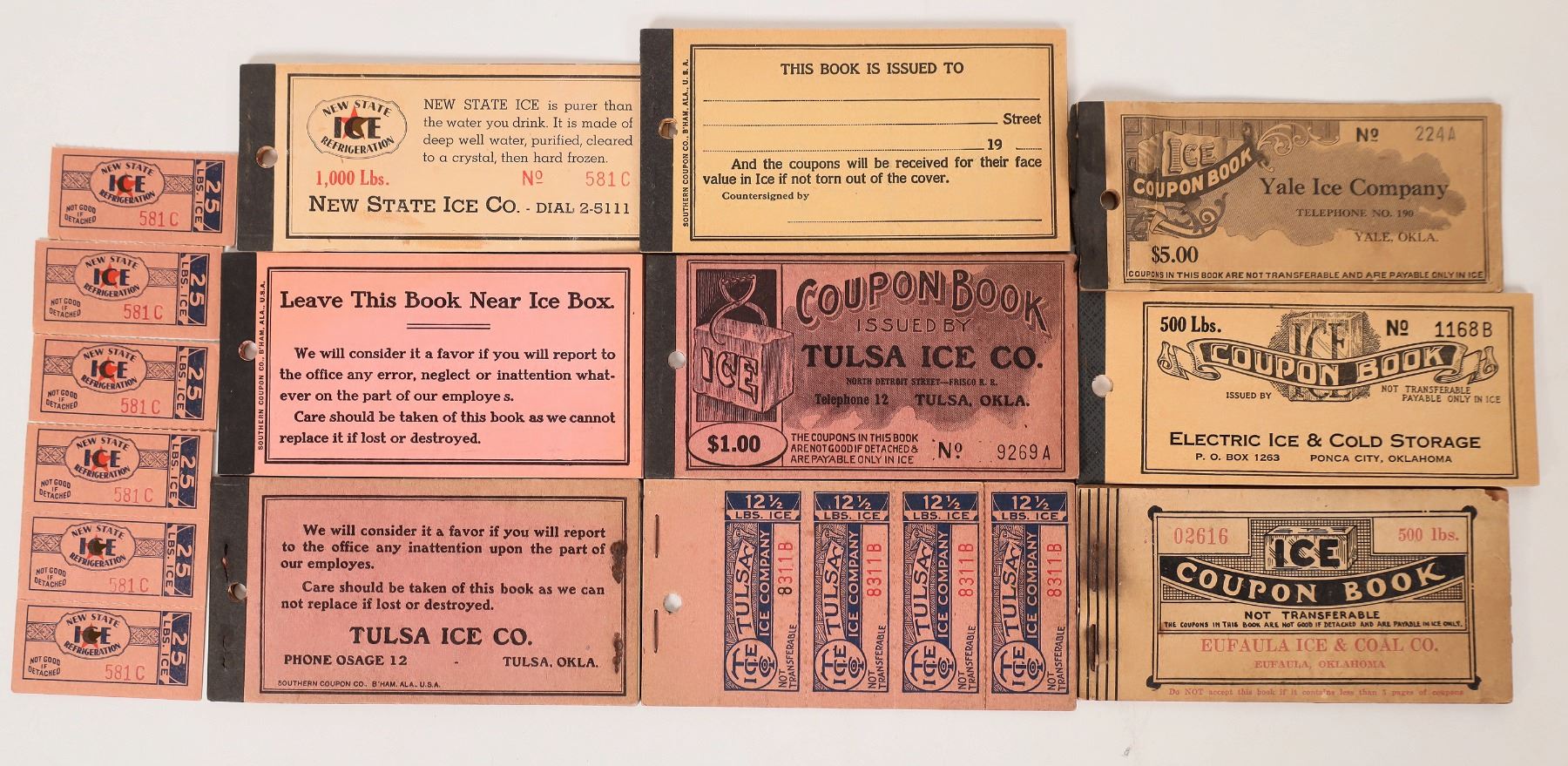 When The Iceman Cometh, leave the coupon book nearby. Nine coupon books from ice companies of Oklahoma. Lightner Ice & Cold Storage, Claremore; Tulsa Ice Co. (telephone 12); Electric Ice & Cold Storage, Ponca City; Yale Ice Co., Yale; Eufaula Ice & Coal Co.; Claremore Ice & Cold Storage; New State Ice Co. Oklahoma