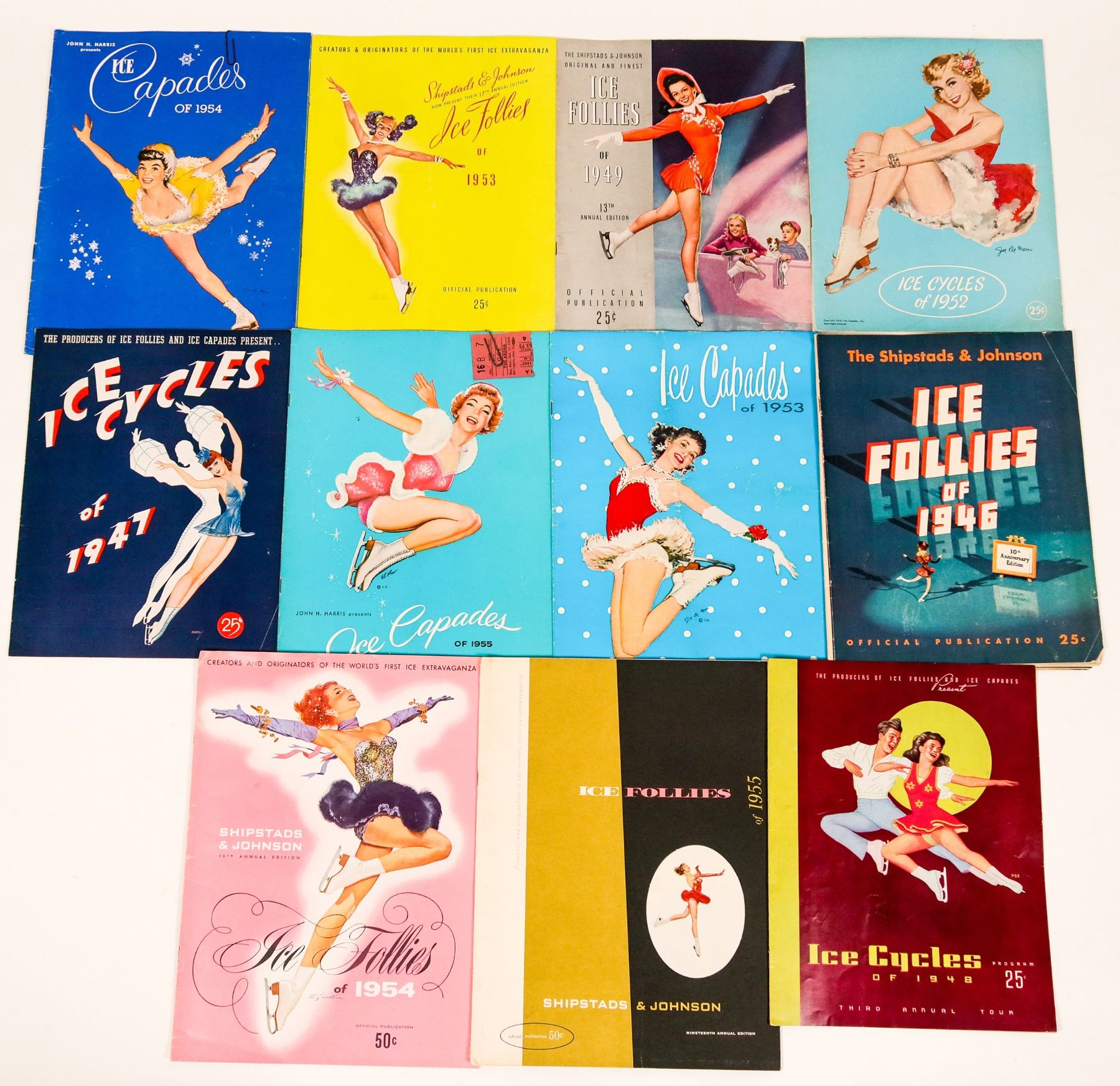 Group of 11 programs from the Ice Follies and Ice Capades shows, c1941-1955. Includes two with torn tickets attached, many pages of photos and highlights, and advertisements of the day, with a 1954 Ice Capades program back cover advertisement of a performance by Snow White and the Seven Dwarfs.