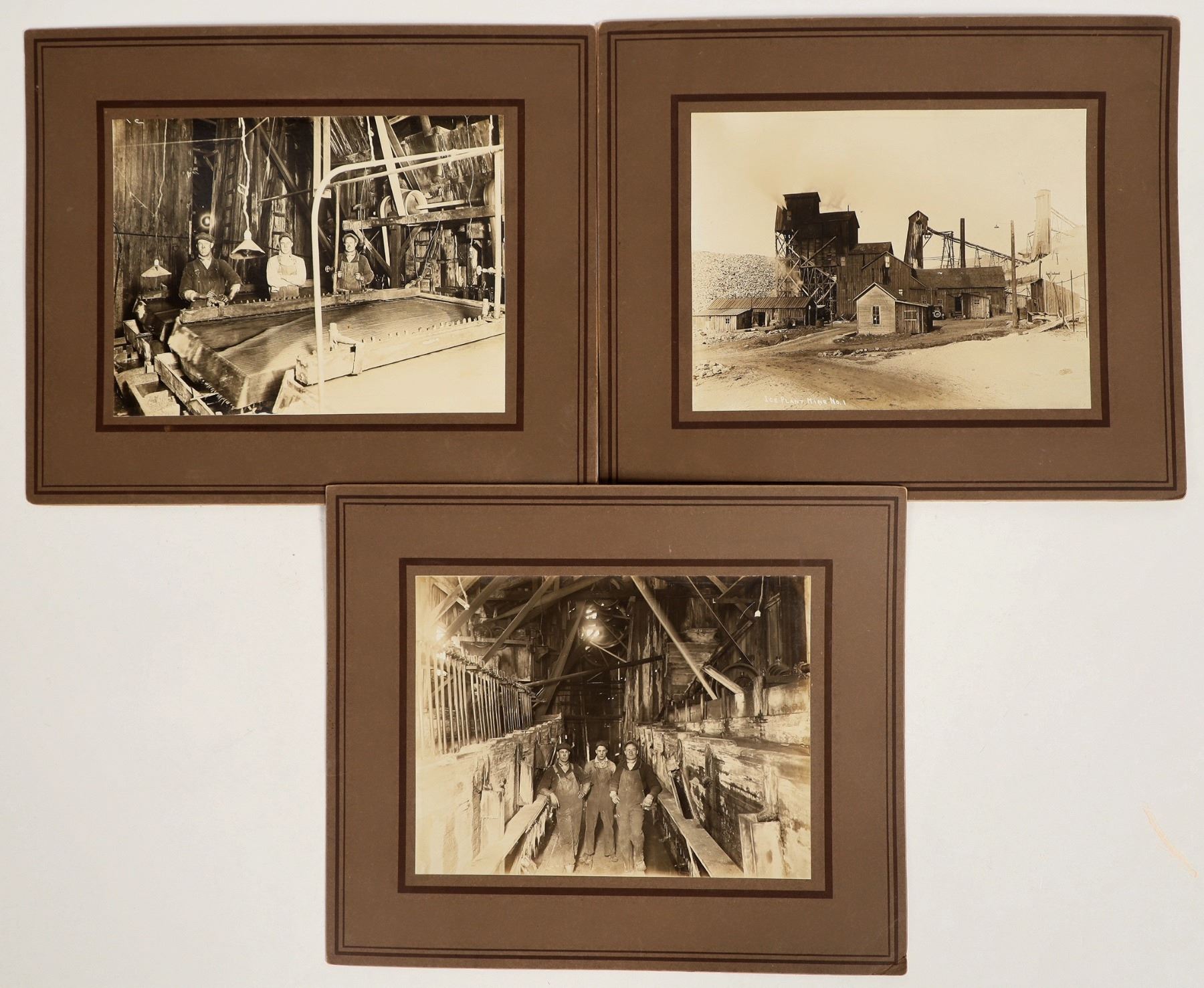 Lot of three different. The Ice Plant Mining Company had operations at Webb City, Missouri. According to the 1918 Mines Handbook, the company leased 40 acres of mineral land belonging to the Guinn Investment Co. Developments included 3 shafts to a depth of 180 feet. Owned a 300 ton concentrating plant. 1) Exterior view of the mine and mill with an automobile in view. 2) Mill interior view with three miners. 3) Different mill interior view with miners standing at table. All 3 are 6 x 8" photos on 10 x 12" mounts. Stamped on the back for Edgar Linton, Commercial Photographer in Joplin, Jan. 29, 1917.