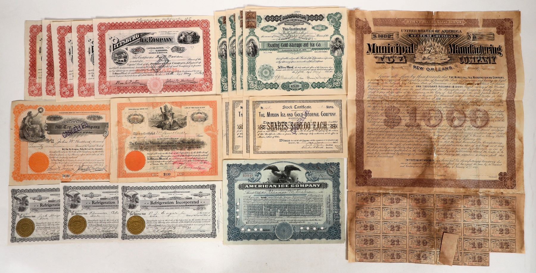 Bond-1892 Municipal Manufacturing of New Orleans, poor condition. Stocks-4x 1904-05 Marion Ice and Cold Storage, 1x 1906 Crystal Ice Manufacturing and Cold Storage, 1x 1924 American Ice, 3x 1933 Refrigeration Inc, 1x 1929 Hill Top Ice, 5x 1900-13 Reading Cold Storage and Ice, 5x 1907-26 Pittsburg Ice.