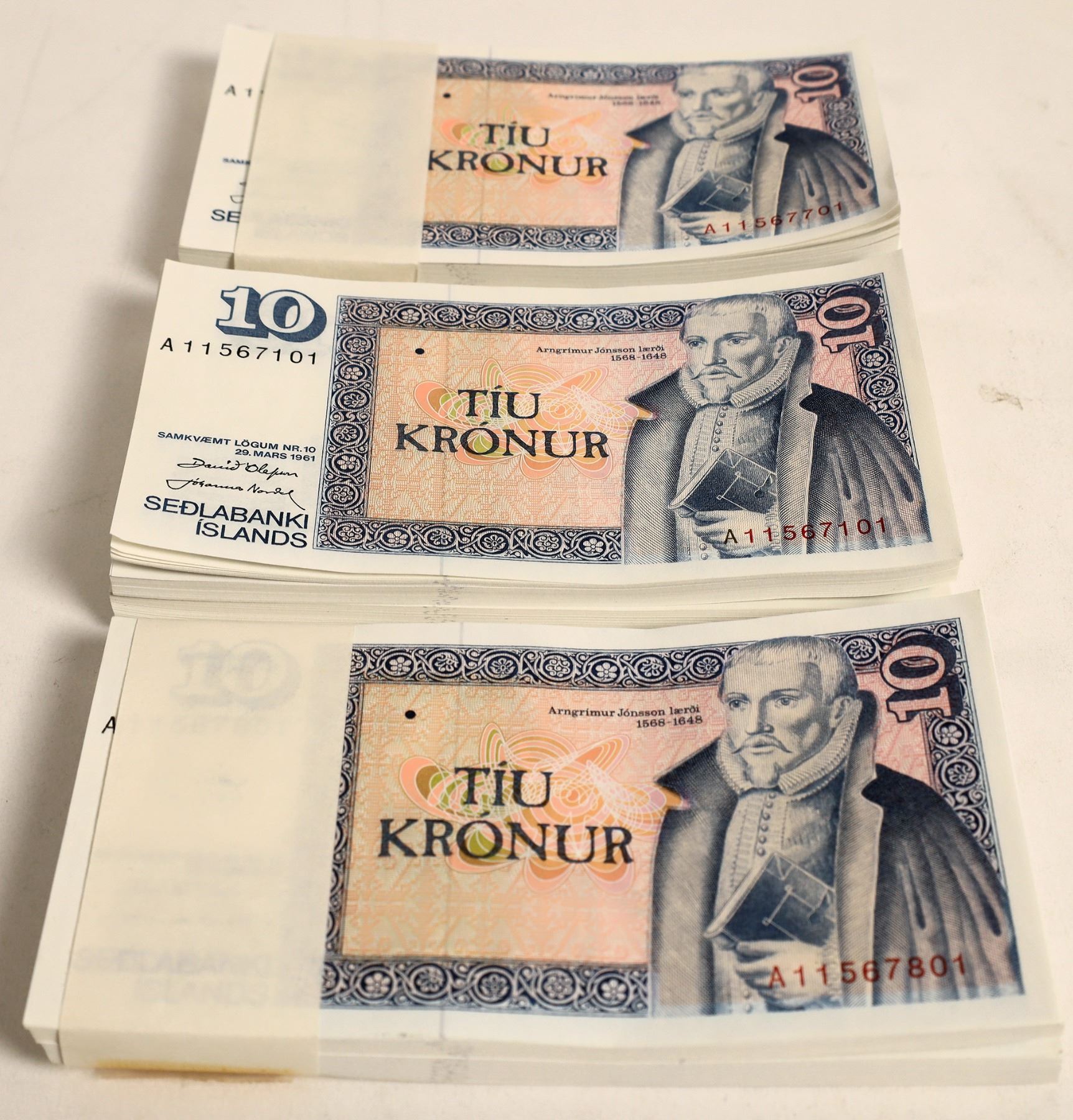 Three hundred crisp uncirculated ten Kronur notes from Sedlabanki Islands (Iceland): Obverse: Scholar Arngr"mur JÛnsson the Learned (1568-1648) Reverse: Old Icelandic household scene based on Auguste Mayer's drawing in Gaimard's "Voyage en Islande", and pictures of a jug, bowl and artefacts connected with the head-gear of the national costume. P#48.