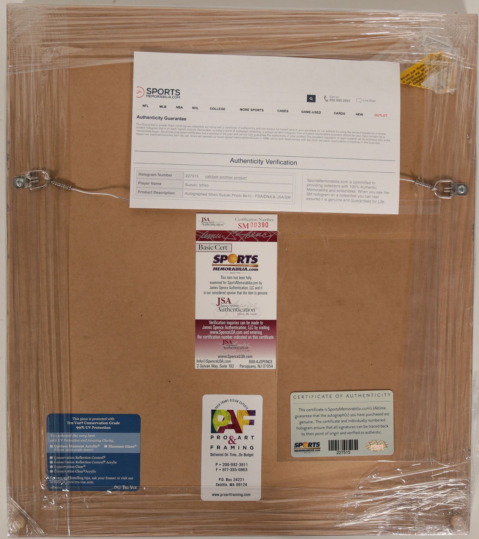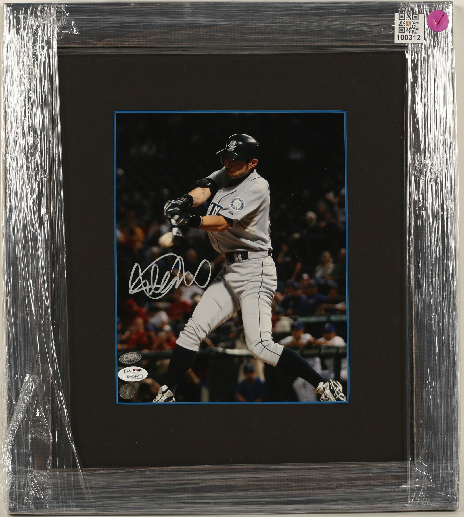 Stellar 8 x 10 photograph of 7x All-Star, 7x Gold Glove winner Ichiro Suziki making an in-game hit. Contact with ball can be seen in photo. Autograph in silver on the left center of the photo. Comes with beautiful black frame; 15 x 1 x 17.JSA Certification: SM00390. SM: 227515. 3 Holograms on photo.