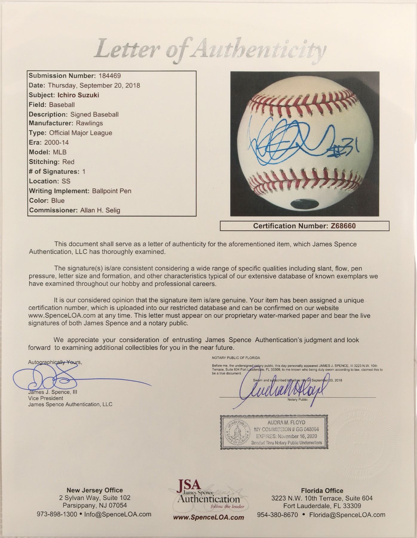 This autographed baseball signed by Ichiro Suzuki of the Mariners #31. It comes with a letter of authenticity and tamper proof hologram. Ichiro recently retired from baseball goes down in history as the most hits fro a Japanese-born ballplayer in MLB history.