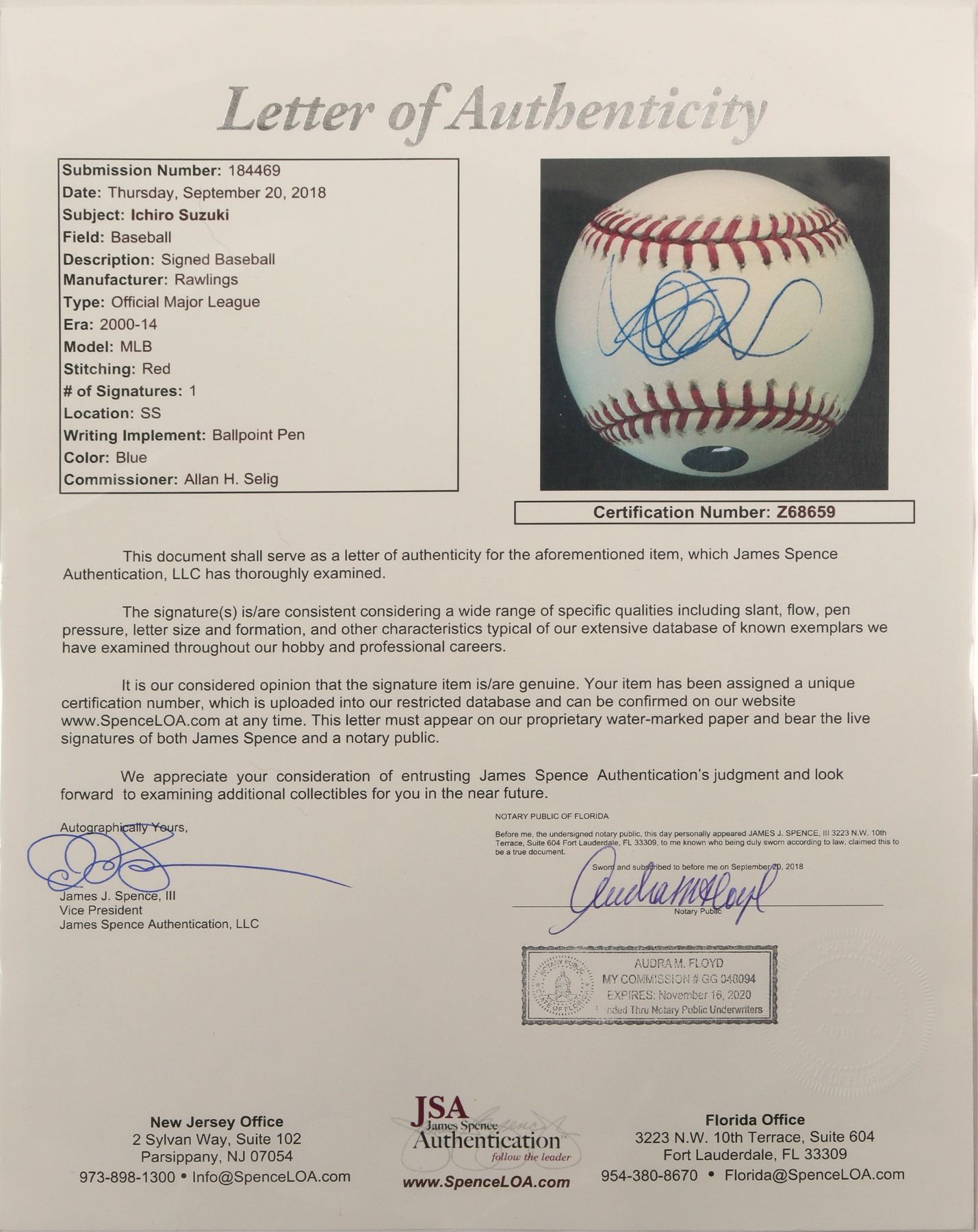 This autographed baseball signed by Ichiro Suzuki is heavily authenticated with letter and JSA #Z68659, hologram #204522, and Authentic Collections #AB006394609. Comes in the original Rawlings box that shows wear.
