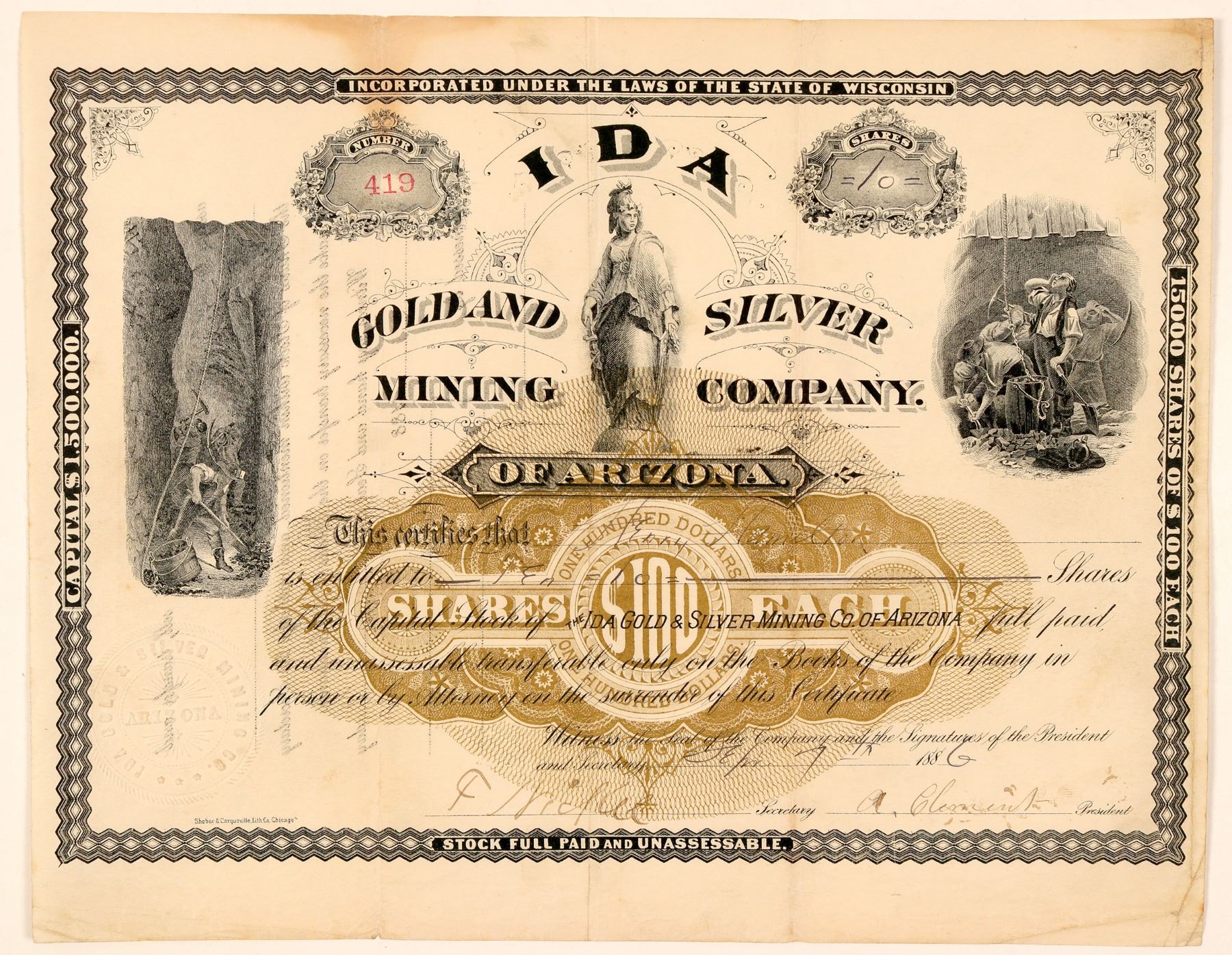 # 419 for 10 shares to Henry Hamilton. Signed by president A Clement and secretary (?). Dateline 1886. Incorporated in Wisconsin. Three vignettes: two underground mining scenes and an allegorical woman. Brown underprint that resembles a fancy revenue stamp. $100 per share. Shober & Carqueville printer, Two vertical folds. Border issues especially at corners and folds. Please see online hotograph. Ida was part of the Arizona Queen before it got split off or leased in 1884. It was one of the best timbered and watered areas in Arizona. A neighboring mine, the Chicago, was one of the best producing mines in the area. [Hamilton] Ken Prag Collection