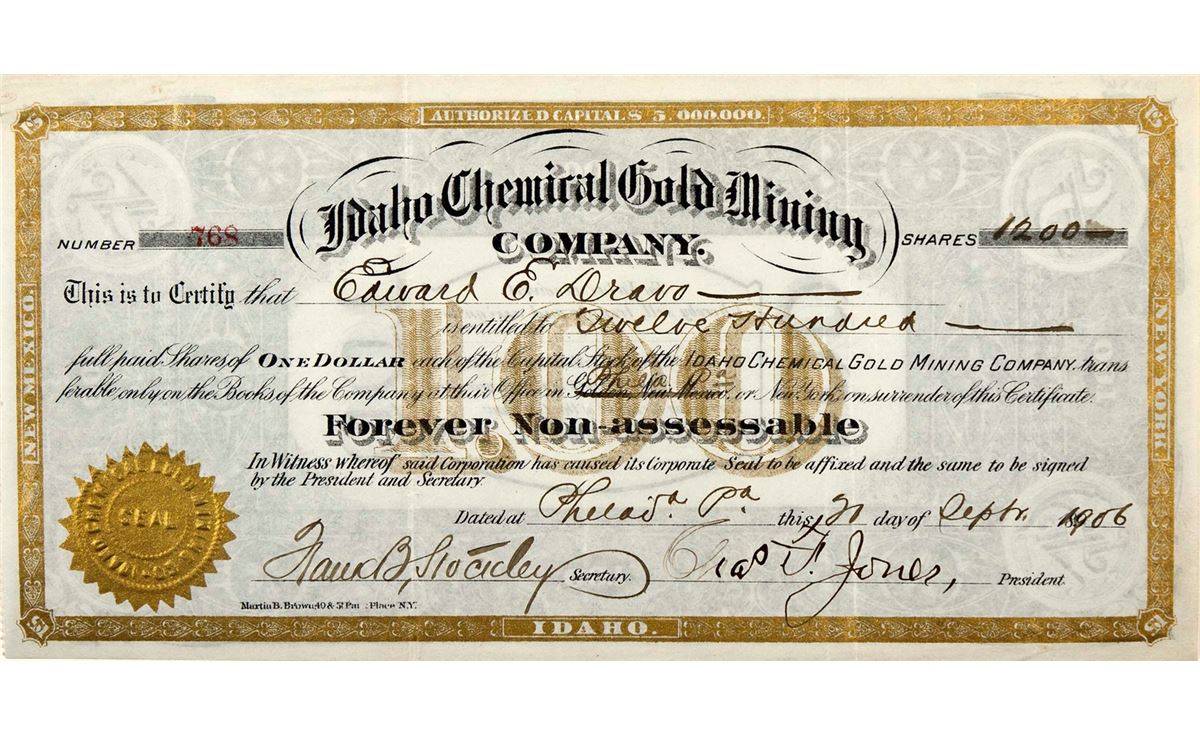 Measures 8 ¼” x 4”. Incorporated under the laws Stock number 768 for 1200 shares. Issued to Edward E. Drauo on September 10, 1900. Signed by Secretary Frank B. Siocicley. President Chas G. Jones. Gold border and blank print on blue color paper. Gold embossed seal in the lower left corner. Two creases on the stock from being folded in the past. U/C