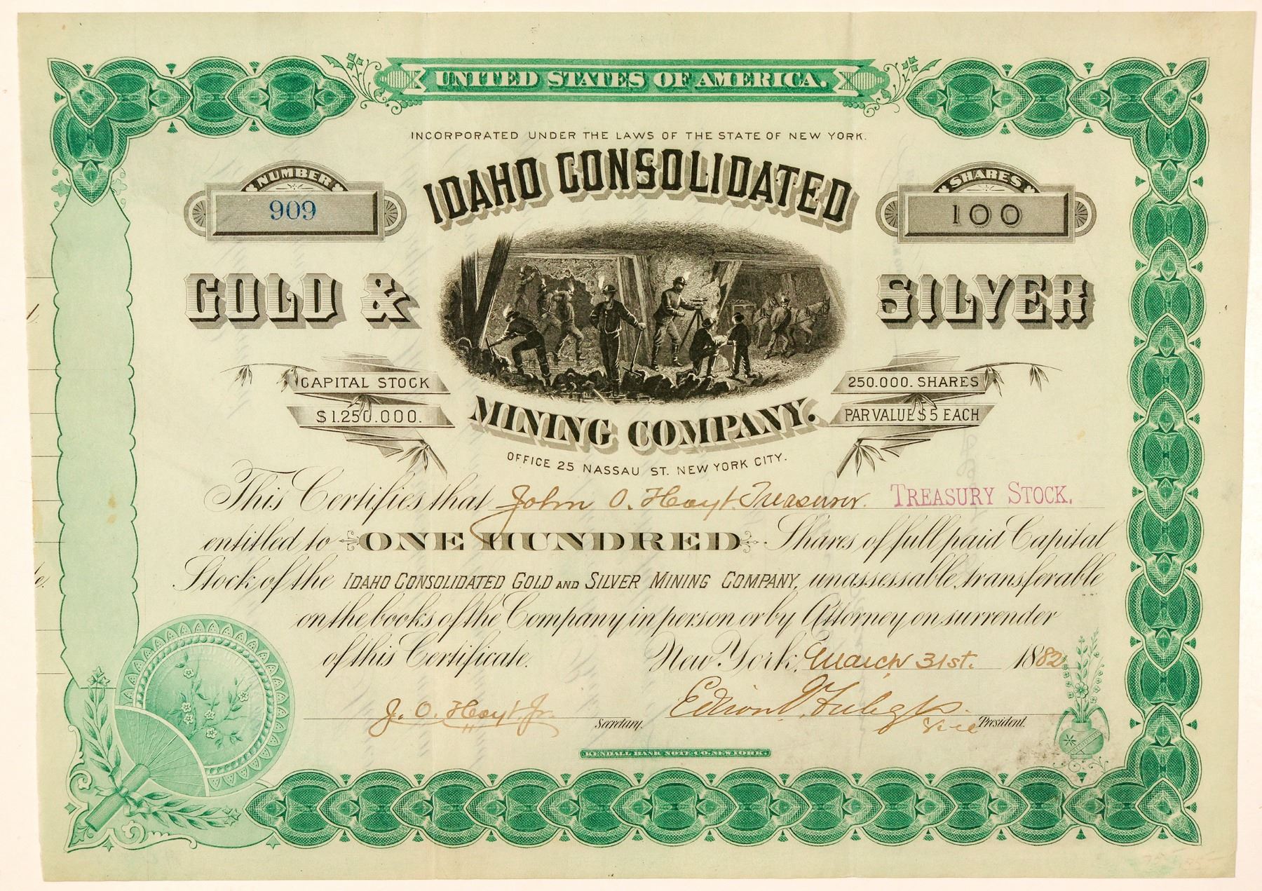 Located at Soldier, Idaho, according to The Mining World, Vol. 22. Inc. in New York. No. 909, issued for 100 shares to treasurer John O. Hayt on March 31st, 1882 in New York. Signed by Hayt and the vice-president. Not cancelled. Green border and background, underground mining vignette. Printed by Kendall Bank Note Co., NY. Folds, light wear. Very clean. 8 x 11" Ken Prag Collection