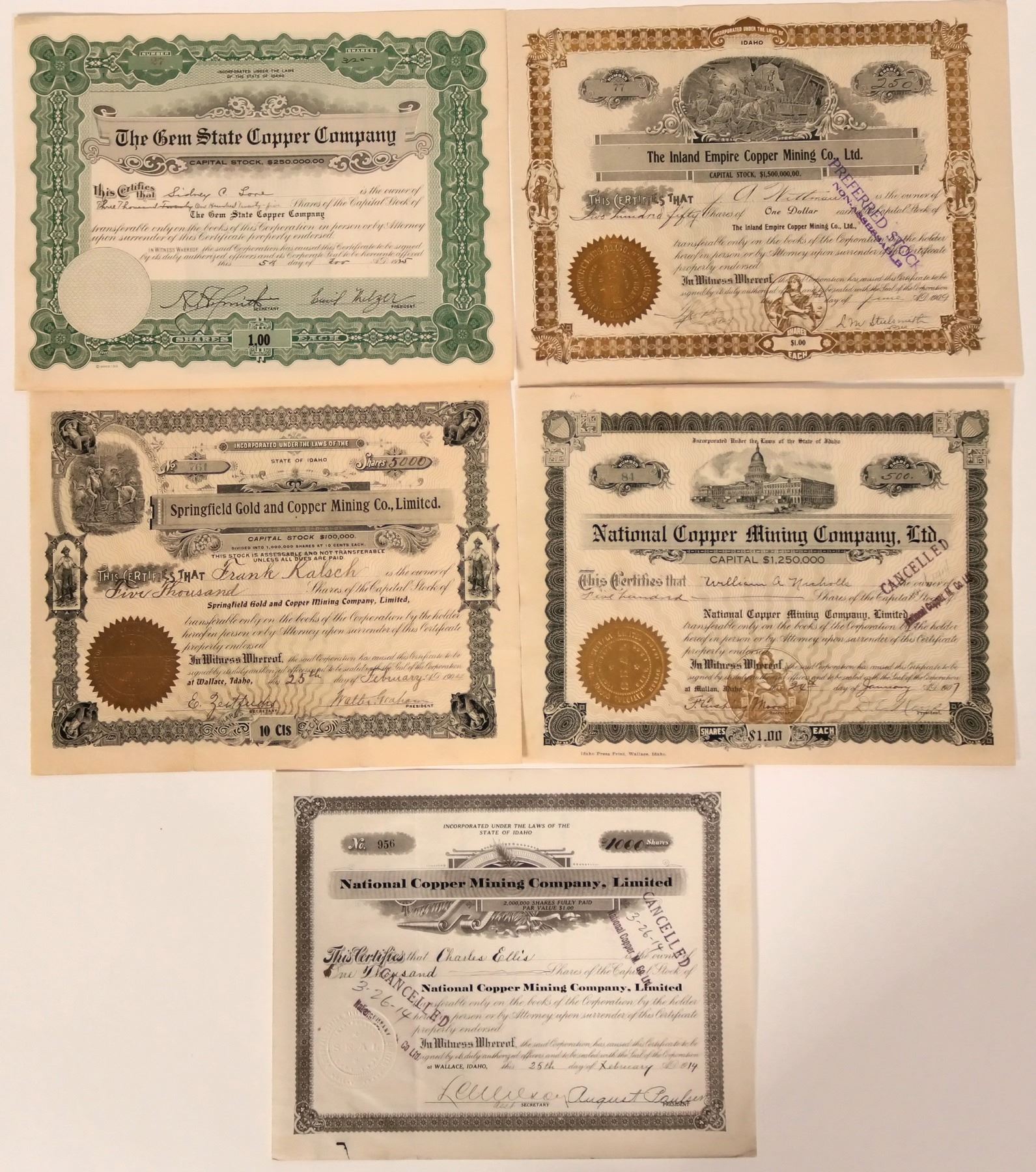 Lot of 5 different. Included: National Copper Mining Co., Ltd. (1907 with capitol building vignette and 1914); The Inland Empire Copper Mining Co., Ltd. (1909, mining vignette); Gem State Copper Company (1925); and Springfield Gold & Copper Mining Co., Ltd. (1904, mining vignettes). Good condition.