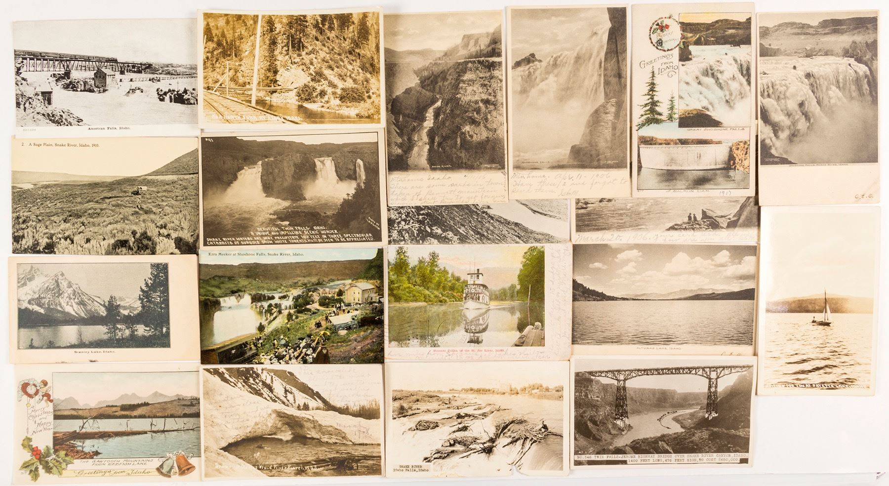 Lot of nineteen. Three black & white RPC's (snow slide over wood river in 1933, Payette Lake, North Fork at Avery), twelve black & white, and 4 color. Please see photographs online. Date: Location: Idaho HWAC# 54537