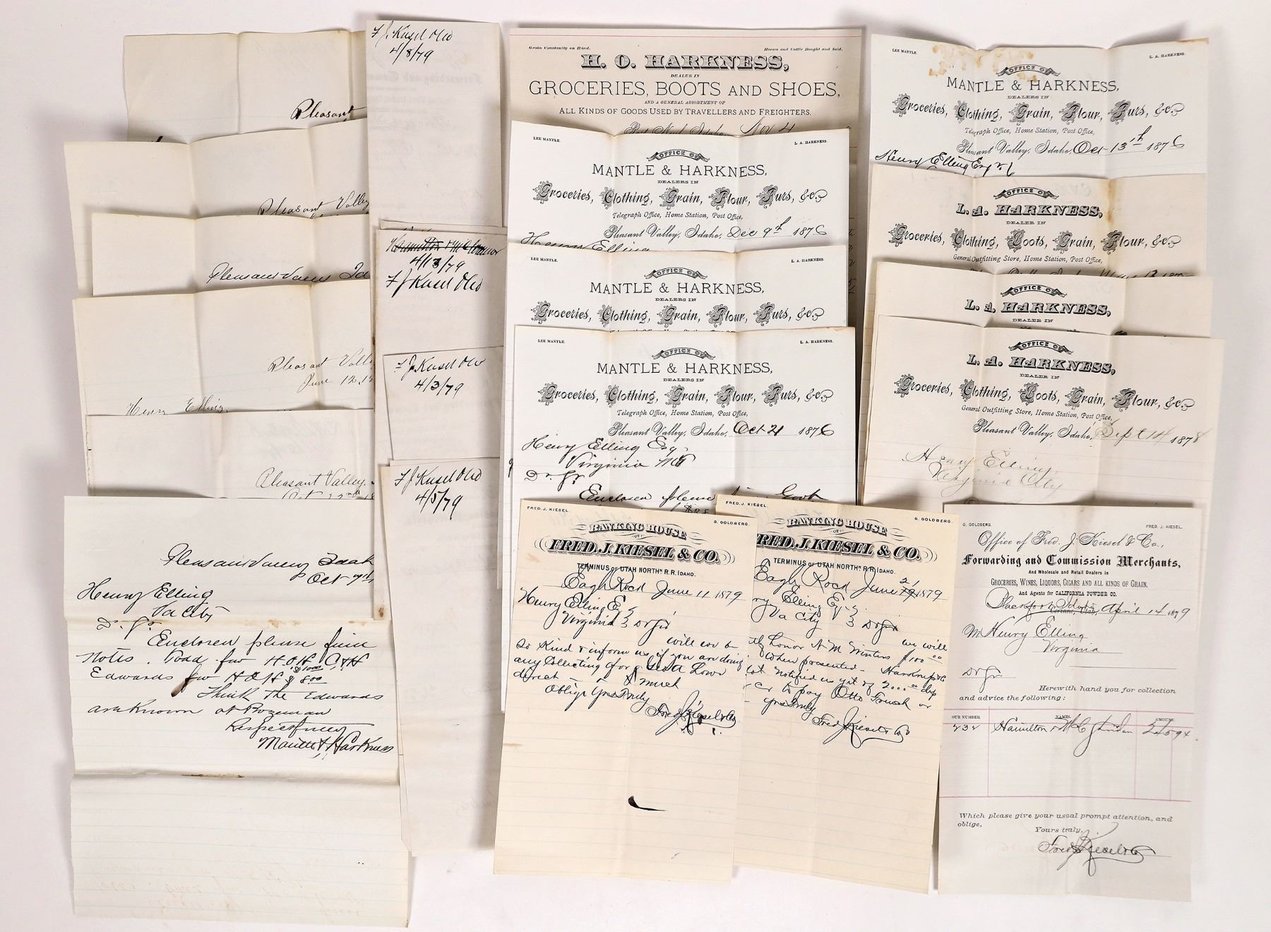 About 20 Idaho letterheads and billheads c. 1876-99 to Henry Elling, Virginia City, MT related to business transactions.