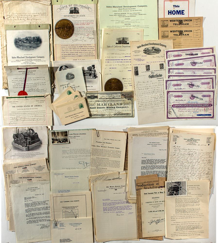 One file by John Fulton, superintendent of the Idaho-Maryland Mine, Grass Valley, California. Includes: many letters (some correspondence favoring the passage of the McFadden Bill (providing an excise tax on gold used in the Arts and Manufacturing) with people from the U. S. House of Representatives and Senate, 1920); booklets (Our Vanishing Gold Reserve); newspaper articles; receipts. A second folder for the Idaho-Maryland Development Company contains patents, prospectuses, 6 cancelled stock certificates for the Brunswick Consolidated Gold Mining Company; stockholder proxy voting cards (1942); etc.